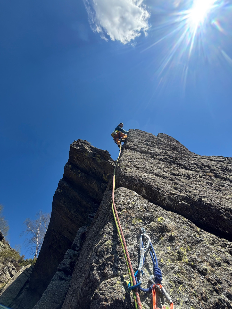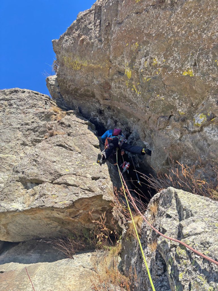 E così arriviamo al 24 aprile 2025, stavolta ci siamo. Ripetiamo i tiri già chiodati e si riparte. Traverso verso sinistra e a seguire lungo la parete ovest, ancora all’ombra, una fessurona da camminarci dentro fino a giungere a una placca. Vorrei proseguire in traverso, ma la placca diventa strapiombo, no bbuono… un bel passaggio espostissimo, i piedi sul bordo del vuoto, penso malignamente a chi ripeterà il tiro da secondo… risalgo in verticale, un friend per riuscire a chiodare una bella sosta aerea; e recupero Lorenzo, che mi manda un po’ di accidenti mentre avanza sulle uova. Ultimo tiro: sto per attaccare la placca fessurata a sinistra, ma guardiamo in su e vediamo uno spigolo che nemmeno lo spigolo nord dell’Agner… allora si va su per lo spigolo e, vabbè, saranno solo 15 metri, ma che sensazione fantastica… e finalmente la grande avventura ha termine!