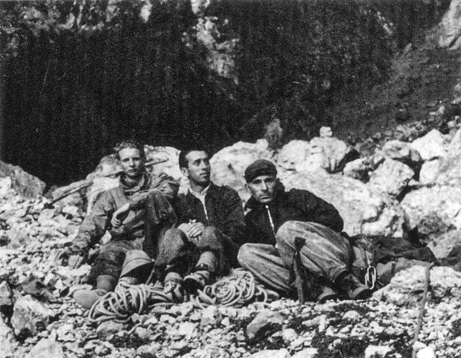 Sono impegnati sul Torrione San Vito, un contrafforte del Re del Cadore, a rigore una cima minore che incombe sull’imbocco dell’Antermoia: ma tale aspetto presenta scarsa rilevanza, ciò che davvero conta è che hanno superato difficoltà costantemente appartenenti all’orbita del sesto grado. E per di più rallegrati dall’età spensierata, quanto dalle irresistibili battute di Emilio, capace di tenere alto all’occorrenza l’umore della cordata. Della quale, in ogni caso, rimarranno proverbiali nel tempo, oltre alla bravura, qualità mai abbastanza apprezzate come modestia e semplicità.