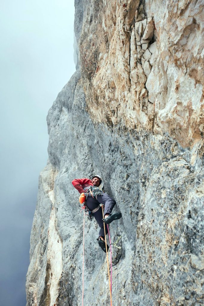 Dopo aver sfinito Titus per oltre tre ore, la parete si dimostra di nuovo benevola e un ultimo tiro della giornata si conclude su una stretta cengia. La montagna però è ancora lontana dal mollare, mostrandosi misteriosa ed invitante come nell’appena incontrata serie di bellissime fessure che caratterizzano i successivi tiri. Ma solo grazie a durissimi passaggi su placca sarà possibile spostarsi poi dall’una all’altra. A complicare le cose si aggiunge la spiacevole circostanza che non sempre i compagni riescono a scorgersi vicendevolmente, a causa della nebbia presente per buona parte della giornata, creando isolamenti anche psicologici, seppur non tali da impensierirli particolarmente. Il tramonto li trova esultanti sull’anticima: se anche manca ancora un po’ alla vetta e il percorso appare complicato, ormai il più è fatto e pure quell’ulteriore bivacco viene accettato serenamente, come osserverà Alex l’indomani: «Assorbiamo i primi raggi di un nuovo giorno, liberando energie nascoste che ci fanno arrivare in cima e ritornare a valle leggeri, anche perché ormai avevamo finito il cibo e l’acqua…».
