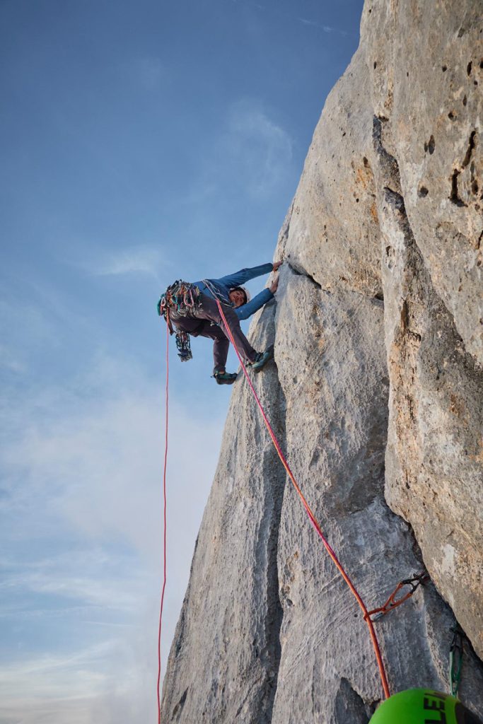 All’alba attacca Martin, incontrando terreno impegnativo ed esposto e successivamente delle placche. Poi è la volta di Titus a condurre la cordata su ottima roccia, le cui difficoltà salgono però rapidamente, arrivando ad un altissimo livello. Il tempo frattanto passa in modo quasi inavvertibile, tanto da accorgersi con sorpresa che già sta imbrunendo, obbligandoli a scendere su una cengia abbastanza pianeggiante e tale da assicurare una notte relativamente comoda.