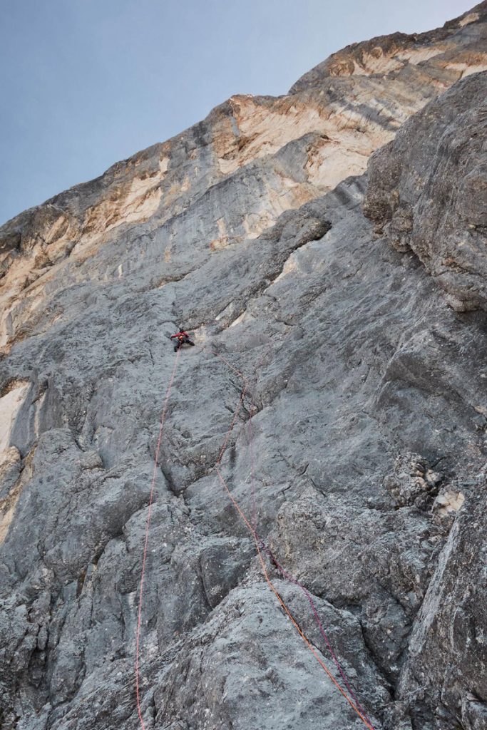 L’indomani (6 ottobre), risalita la corda alle prime luci, Titus riprende il comando, rendendosi conto di quanto l’impegno continui ad essere elevato, sebbene senza troppa sorpresa, avendo immaginato che l’Antelao avrebbe dato loro del bel filo da torcere. Alex, che non perde alcun particolare di quanto sta avvenendo, ricorderà al riguardo: «Grazie ad alcuni passaggi in libera estremamente difficili, Titus riesce a salire la placca più repulsiva. Ma non è finita, seguono altri quindici metri di scalata impegnativa con protezioni precarie e lontane».