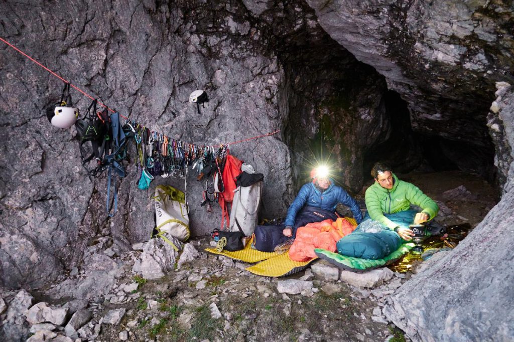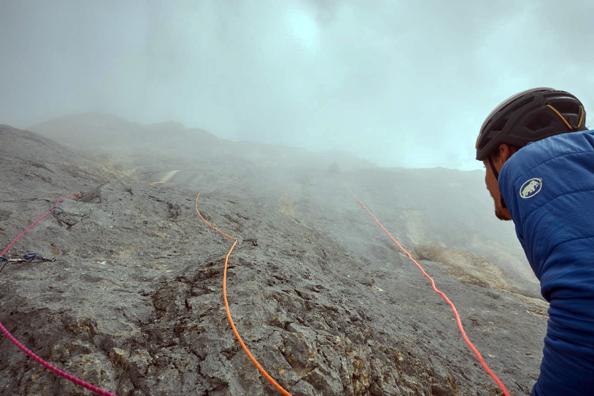 A cose fatte, non pare che in quel giorno autunnale la montagna stia esattamente dando loro il benvenuto, visto l’avvicinamento disagevole, il fastidioso piovigginare e la fitta nebbia che cupamente avvolge ogni cosa. Tutto ciò però non sembra turbare i tre, che poi trovano riparo per un paio d’ore in una piccola grotta: «La visibilità stenta a migliorare, così come il nostro morale. Ormai è già pomeriggio e le giornate di ottobre sono corte». Perciò concludono che sia meglio non perdere tempo e iniziare l’arrampicata con cinque tiri di corda su roccia solida che li conducono in un’ulteriore grotta insolitamente profonda, dove trascorrere la notte senza troppi disagi.