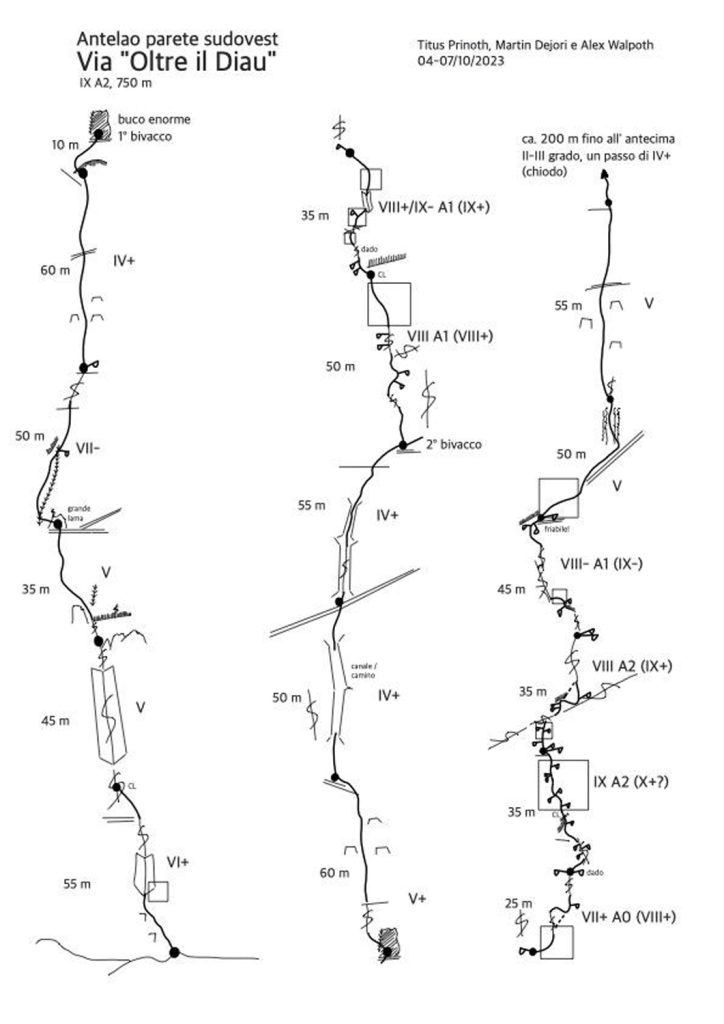 Qualche anno dopo, il 4 ottobre 2023, fanno la loro apparizione al cospetto del Re del Cadore i gardenesi Martin Dejori, Titus Prinoth e Alex Walpoth. Ragazzi non comuni, e comunque già noti, se si pensa che nel 2015 (e qui con loro era anche Giorgio Travaglia) avevano aperto la via degli Studenti, nel cuore della parete nord-ovest della Civetta, con difficoltà fino al VII grado, meravigliando il mondo dell’alpinismo anche perché all’epoca Titus, in particolare, aveva appena sedici anni.