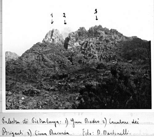 Noi risaliamo i ripidi pendii erbosi verso il Canalone dei Briganti. Naturalmente, senza guida, sbagliamo. Per raggiungere una terrazza, da cui tramite un’ulteriore cengia si può arrivare al Canalone dei Briganti, bisogna salire un diedro irregolare. In libera non ci riusciamo, così pianto un chiodo e vi aggancio una staffa. Sono slegato, dunque scendo e gli cedo il passo. Alberto, legato, arriva alla terrazza, una specie di grosso pulpito. Poi, per mezzo di un cordino, gli faccio tirare su gli zaini. Tocca a me salire, ma mi manca il martello per schiodare, lui me lo manda giù per mezzo della corda.