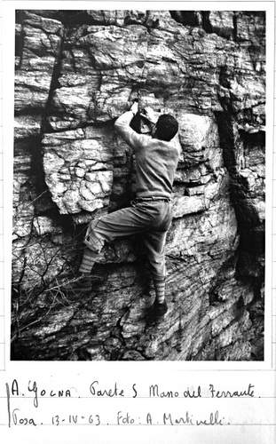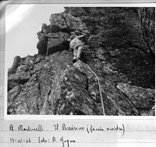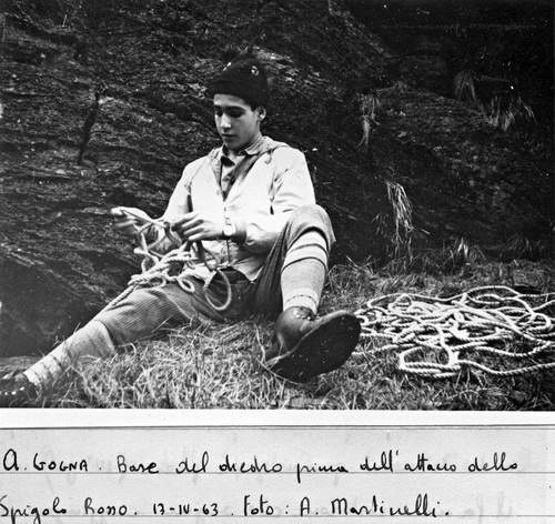 21 ottobre 1962. Sveglia alle 6.45. Mi metto addosso le solite cose: scarponi, calzettoni, calzoni alla zuava e, novità, la camicia “scout”. Con uno zaino bello pieno e grazie alla “30” mi ritrovo alle 7.35 alla Stazione di Piazza Principe. Alberto Martinellì è già lì ad attendermi, pronto e vestito come me, a parte il sacco, ridicolo nella sua piccolezza. Come ha fatto a farci entrare corda, chiodi, moschettoni, staffe, cibi e un maglione proprio non lo so.