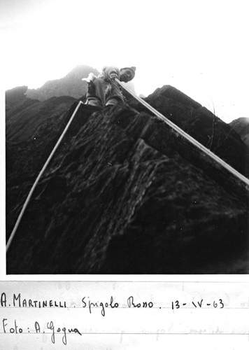 Ci leghiamo e salgo per primo, armato di tutto. Pianto un chiodo in basso dove non serve a niente. Assicurato, proseguo. C’è un cespuglio che mi ostacola: lo tagliuzzo con il coltello! Salgo per tre metri e pianto altri due chiodi. Beh, di sicuro non siamo all’altezza. Per di più ai chiodi attacco le staffe. Sapevo già però chi era stato Paul Preuss e pensavo che se mi avesse visto gli sarebbe venuto un colpo! Perdiamo tempo anche a scattare foto che tra l’altro non riusciranno. Scendo perché sono stanco, poi sale lui senza significativi progressi. Allora riparto io e riesco ad agganciarmi a un chiodo trovato lì. Poi tocca di nuovo a lui e in tanti va e vieni la corda è stranamente a zeta! Non ci facciamo caso, in una serie di idiozie incredibili. Mi metto dietro di lui, assicurandolo solo in teoria, gli porgo i moschettoni e le staffe che ha lasciato in basso, mentre lui pianta chiodi a tutto andare. Frattanto la corda, tirata da un capo e dall’altro, si blocca e lui non può più andare avanti. Scendo un po’, così Alberto riesce a guadagnare un terrazzino. Si slega e io tiro per vedere se la corda viene: niente da fare. Tiro ancora: niente! Sono bloccato con una mano senza appigli e un piede in una staffa. Tornare non posso, proseguire neppure: l’unica è slegarsi. Ma il nodo si è indurito e io con una mano sola non riesco a scioglierlo. Per fortuna in quel momento arriva il sig. Ravajoni (sì, Piergiorgio, quello che in seguito diventerà un caro amico, NdR) con la sua ragazza e ce ne dice di tutti i colori. Ravajoni è espertissimo e conosce Alberto. E’ davvero infuriato. Dice che abbiamo piantato un sacco di chiodi per niente, che siamo due scellerati, e se questo è il modo di salire, e che abbiamo rovinato il passaggio, ecc.