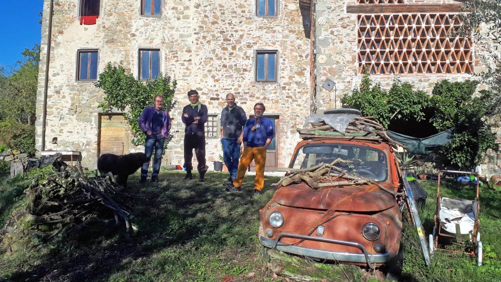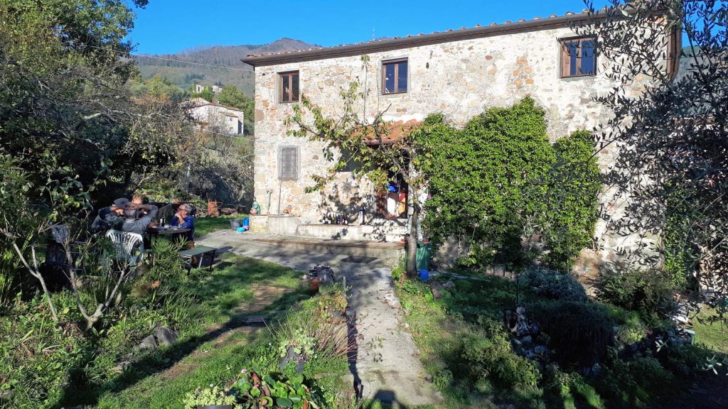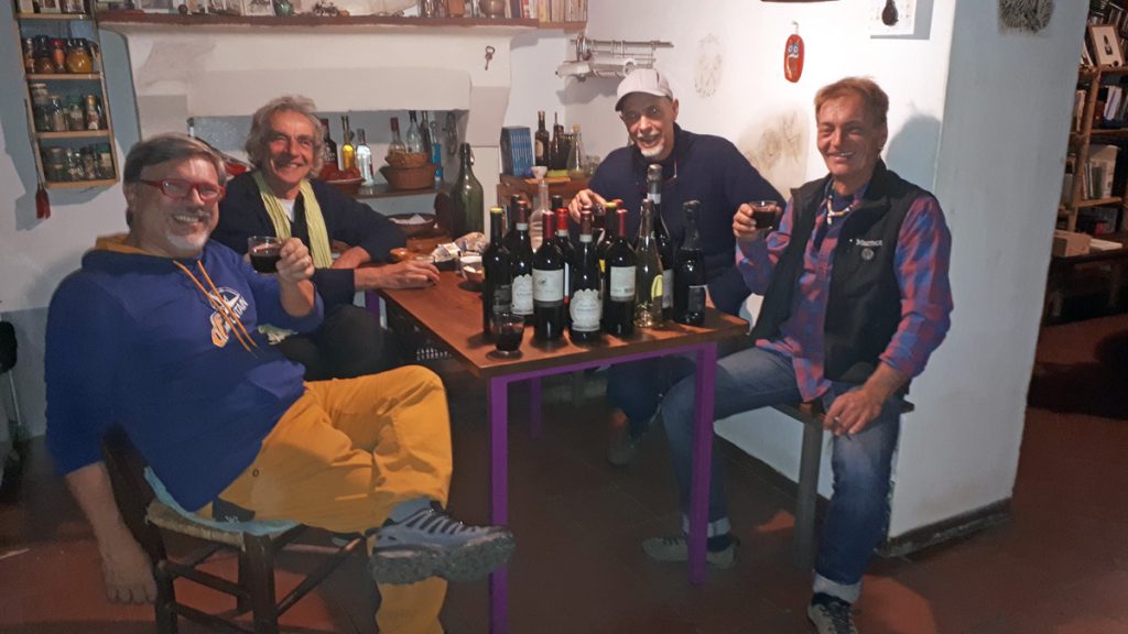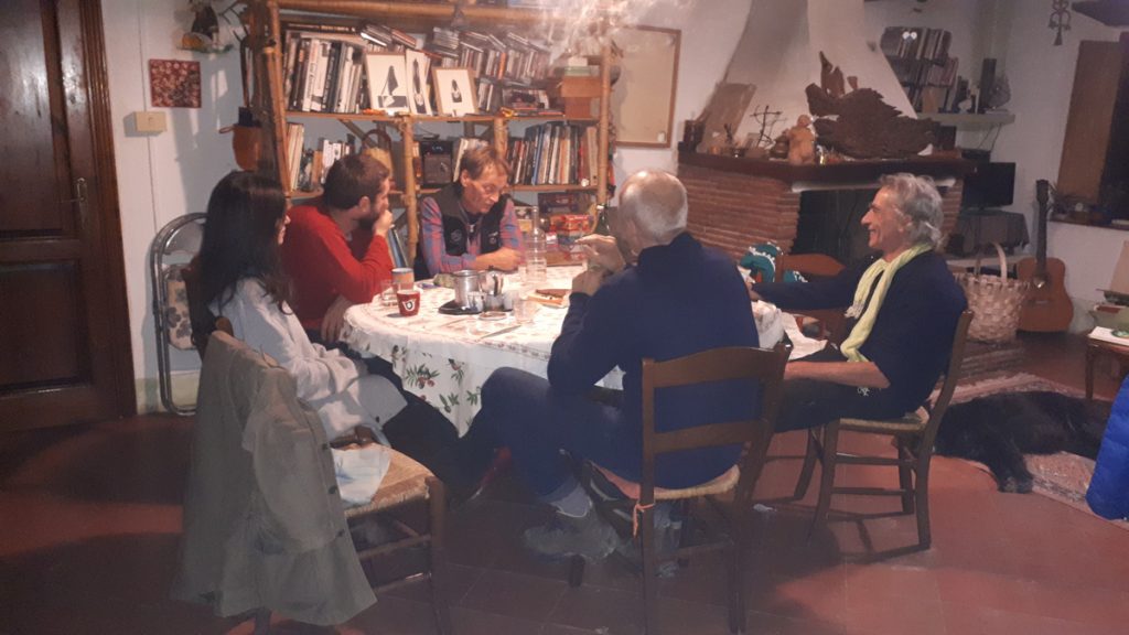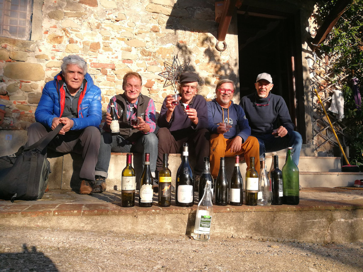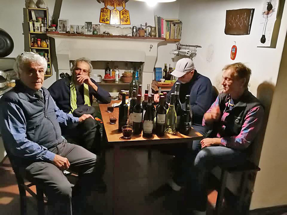 La tentazione di affogare nell’alcol queste problematiche era dietro l’angolo. Una combinazione di eventi volle che il 4 dicembre mi ritrovassi a guidare la mia auto verso Parma. Con me era il co-responsabile di questa fuga dalla realtà, Luca Calvi. A Parma raccogliemmo altri due brutti ceffi, cioè Stefano Michelazzi e Marco Preti, ivi giunti dalle loro case nel Bresciano. Giunti a Lucca ci fiondammo in un supermercato di San Cassiano di Moriano per vedere di non arrivare a mani vuote a casa di Andrea Gobetti. Comprammo, oltre a formaggio grana e salame, un intero carrello (di quelli grossi, con un cesto tipo 110 x 60 x 40 cm, stracolmo di bottiglie di vino. A Matraia fummo accolti da quel magnifico casolare perduto negli ulivi di proprietà di Andrea: ci sentivamo a casa nostra. Anche Giuliana, la moglie, ci accolse con grande calore. Il sole stava tramontando, così ci rifugiammo subito in cucina. Legna nel camino, consegna della dote alcolica. Andrea alzò il sopracciglio e disse: “Dio fa… così tanta roba… ma anche io ho preparato una bella dose di bottiglioni”.