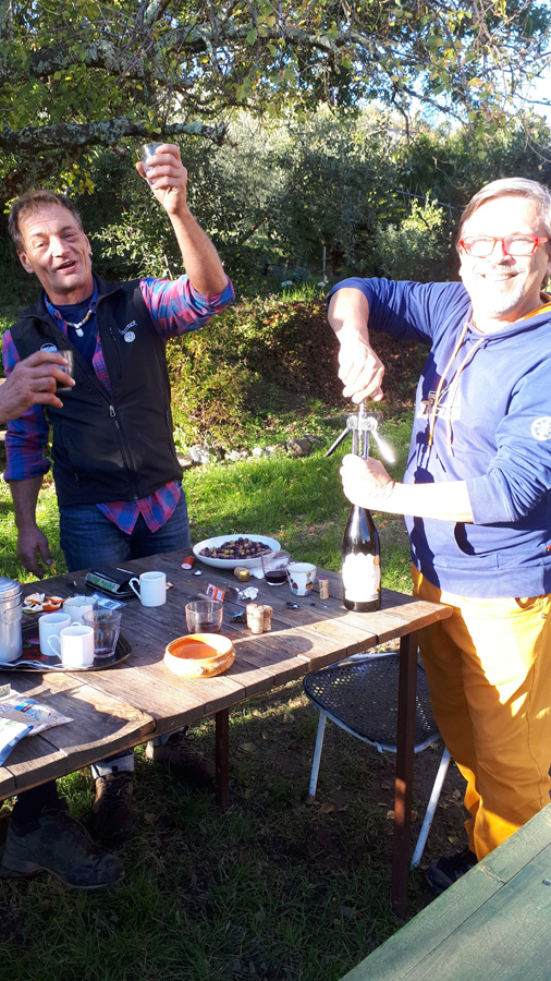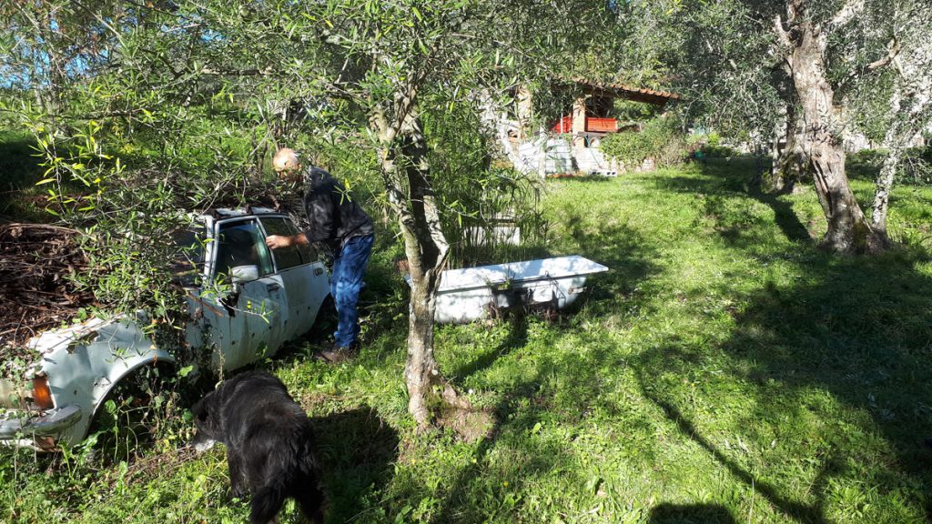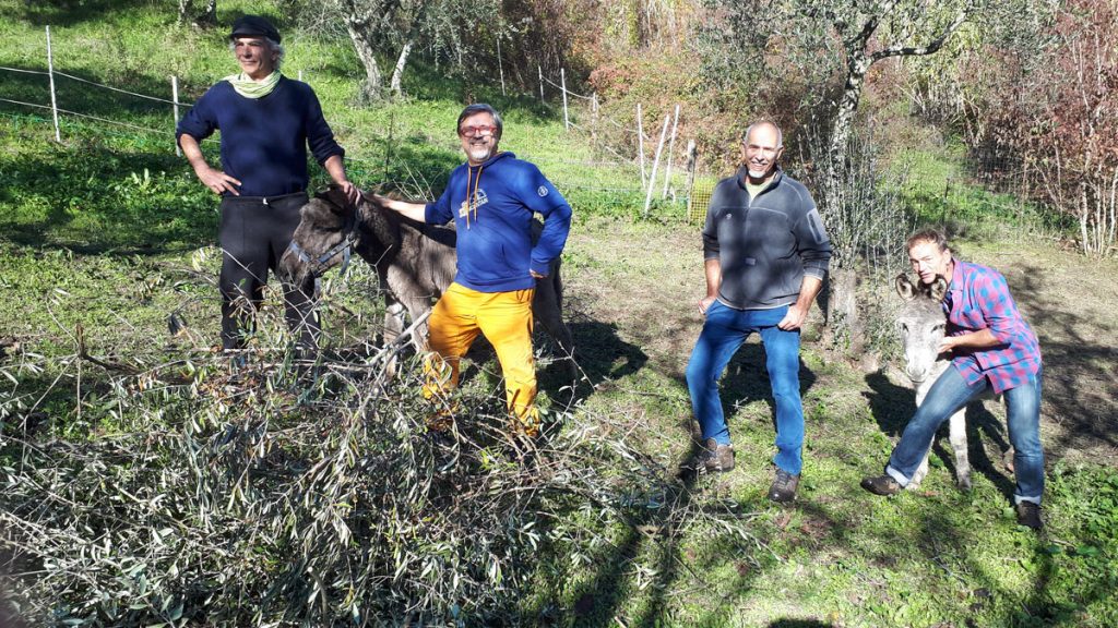 L’aver ripreso a mangiare e bere (fortunatamente ancora niente canne) ci regalò lo sprazzo di buon senso necessario per una sana interruzione. Fuori c’era un bel sole, volevamo anche vedere quel posto con la luce del giorno. Oltrepassammo le auto abbandonate nei pressi della casa, nelle quali era cresciuta la vegetazione, e scendemmo verso i confini meridionali della proprietà. Incontrammo un simpatico contadino, vicino di casa di Andrea, e un gruppetto di somari che abbracciammo sentendoli fratelli nostri. Ritornammo in casa che era ora di pranzo. Erano arrivati anche la figlia di Andrea con il suo compagno. Ci diedero manforte nel consumare altre bottiglie e bottiglioni di vino durante un pasto moderato. La stanchezza cominciava a farsi sentire su tutti dopo poco ci accorgemmo che era già ora di merenda. Esitai un po’ ad accettare il ben di Dio che ci proponeva la tavola imbandita all’aperto da Giuliana, poi cedetti. Nel frattempo nessuno di noi ebbe la presenza di spirito di fare una foto alle bottiglie e ai bottiglioni svuotati. Nella foto ricordo sono infatti presenti solo i “morti” di quel pomeriggio. Avevamo anche chiesto ad Andrea se prevedeva di chiedere un trasporto speciale per le bottiglie vuote al Comune di Lucca.