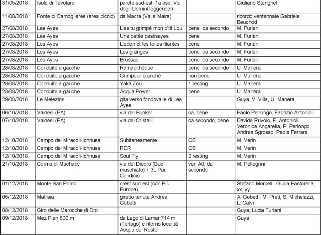 Uno dei punti più difficili fu la realizzazione (ci vollero mesi) della tabella finale delle ascensioni. Vi si prendevano in considerazione solo le salite che presentavano un dislivello di almeno 70 metri e l’ambizione era quella della totalità, con tutti i dati storici riportati (date, componenti delle cordate, ecc.). Alla fine, le salite censite erano 1.011. Poi, dopo la raccolta appunti, venne la stesura testi, alla quale riservai l’intero mese di agosto. Che non mi bastò, perché difficoltà e dubbi mi assalivano ad ogni riga scritta. La maggior parte degli arrampicatori da me contattati collaborò con entusiasmo, solo qualcuno si dimostrò un po’ freddino ma alla fine si concesse. Solo uno, Giuseppe Mantovani, non volle concedere nulla di sé, neppure i dati anagrafici. Facemmo comunque il possibile per scrivere qualcosa su di lui. Molti ignoravano le mie richieste di mandarmi immagini per e-mail e preferivano whatsapp. A nulla valevano le mie deboli proteste, intese a far capire loro che in quel modo la qualità delle scansioni era fortemente compromessa. Sveglia alle cinque e, dopo le quotidiane incombenze di GognaBlog e Altri Spazi, intere mattinate passate al telefono, seguite da pomeriggi di fuoco per mettere ordine in quel marasma di date, appunti, interrogativi e risposte.