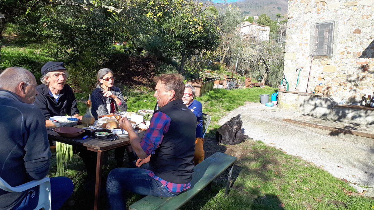 L’aver ripreso a mangiare e bere (fortunatamente ancora niente canne) ci regalò lo sprazzo di buon senso necessario per una sana interruzione. Fuori c’era un bel sole, volevamo anche vedere quel posto con la luce del giorno. Oltrepassammo le auto abbandonate nei pressi della casa, nelle quali era cresciuta la vegetazione, e scendemmo verso i confini meridionali della proprietà. Incontrammo un simpatico contadino, vicino di casa di Andrea, e un gruppetto di somari che abbracciammo sentendoli fratelli nostri. Ritornammo in casa che era ora di pranzo. Erano arrivati anche la figlia di Andrea con il suo compagno. Ci diedero manforte nel consumare altre bottiglie e bottiglioni di vino durante un pasto moderato. La stanchezza cominciava a farsi sentire su tutti dopo poco ci accorgemmo che era già ora di merenda. Esitai un po’ ad accettare il ben di Dio che ci proponeva la tavola imbandita all’aperto da Giuliana, poi cedetti. Nel frattempo nessuno di noi ebbe la presenza di spirito di fare una foto alle bottiglie e ai bottiglioni svuotati. Nella foto ricordo sono infatti presenti solo i “morti” di quel pomeriggio. Avevamo anche chiesto ad Andrea se prevedeva di chiedere un trasporto speciale per le bottiglie vuote al Comune di Lucca.