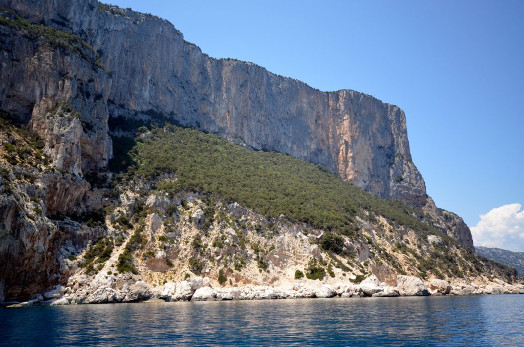 Mario andò in testa e in breve raggiungemmo il bosco in cima che traversammo lungamente per andare a prendere la sommità del grande canalone che delimita la parete. Mario e Giulia erano molto gentili con me, si offrirono di portare tutto il materiale, ma io… era solo di acqua che avevo bisogno… e naturalmente l’avevamo finita. La forza di gravità mi spingeva giù nel canalone di detriti, irregolare, sconnesso. Le ginocchia facevano fatica, ma lì almeno eravamo all’ombra. Dopo aver messo i piedi nell’acqua putrida del primo lago, ci avviammo stancamente nella risalita della dorsale che ci avrebbe riportati alla Tomba del Gigante e a Sedda Ar Baccas. Ormai con il culo in auto, tutto mi convinceva che non avevo più il fisico e che perciò dovevo lasciarmi permeare ancora di più dalla magia della Sardegna, ben oltre le arrampicate: così mi entusiasmai perfino nella classica traversata in gommone da Santa Maria fino a Cala di Luna, con Guya, sua cugina Simona e altri turisti assortiti. A proposito… anche qui ce ne sarebbe da raccontare…