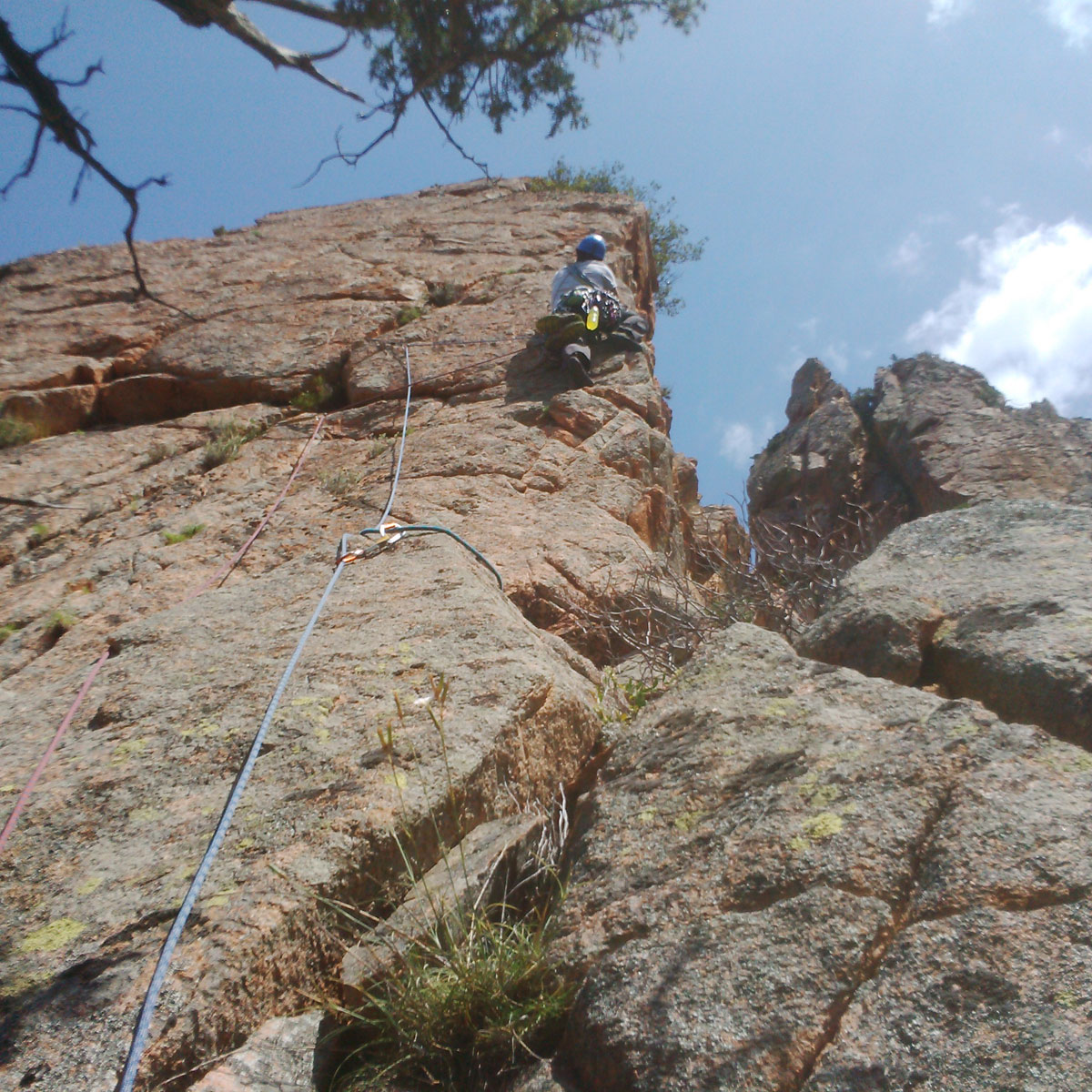 Poi, il dado fu tratto, cominciammo a salire sperando di incontrare e seguire delle pietraie che ci avrebbero potuto evitare macchia e spine. Arrivammo all’attacco dopo 75 minuti. Faceva già caldo e il sole lì non era ancora arrivato. Nella prima lunghezza in diedro-fessura, tra le altre, sistemai una protezione particolare: un vecchio excentric, di quelli pesanti, in voga prima dell’avvento dei friend. Dovevo pur liberarmi il garage! Pregai Marco di lasciarlo lì, a testimonianza della nostra stupidità. Marco proseguì in cresta, al sole, prima facile poi per una bellissima placca solcata da una fessura discontinua. Dopo altre lunghezze arrivammo alla base del risalto finale, un arcigno becco roccioso sul quale avremmo voluto salire per via diretta sullo spigolo: ma il caldo e lo scarso allenamento ci consigliarono il ripiego di salire sulla parete subito a destra. Iniziai senza molta convinzione quell’ottava lunghezza salendo una fessura con un blocco di granito che mi ostruiva l’uscita su un piccolo ballatoio. Anche Marco non era convinto, e quando scesi dopo aver armeggiato un po’, lui si avviò a destra per un’altra serie di fessure. Quella fu la volta buona: dopo molta pulizia riuscì ad arrivare in cima, e io lo seguii trovando un tracciato perfettamente pulito dai blocchi mobili: ci lasciai anche un altro excentric…
