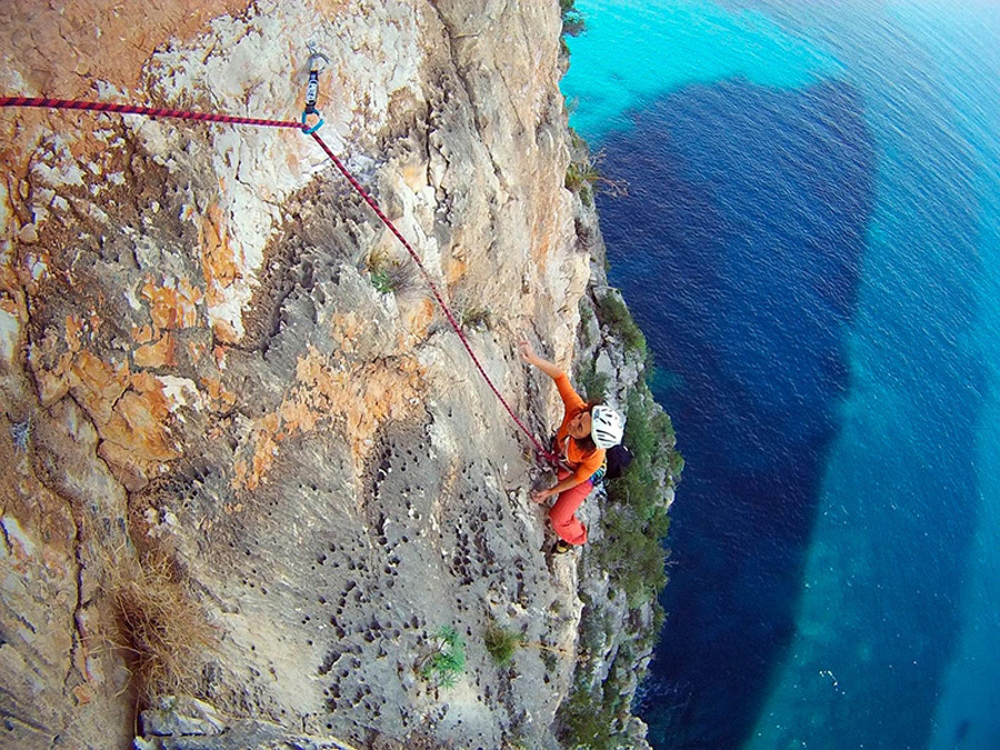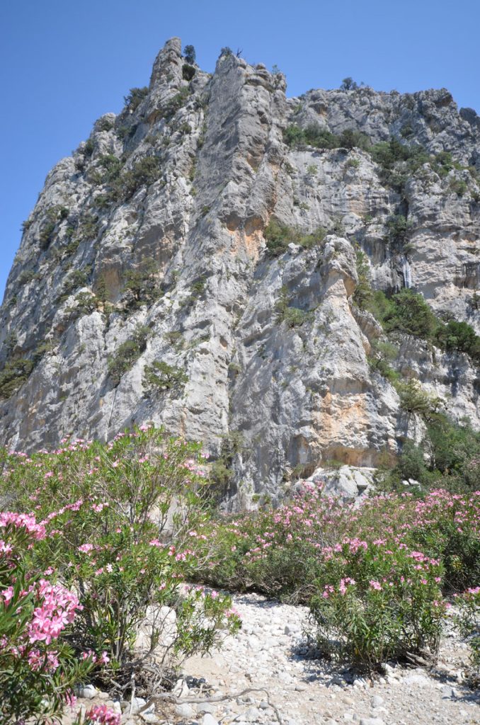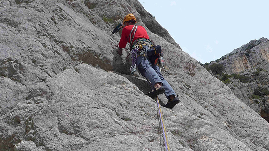 Poi commettemmo lo sbaglio: il giorno dopo ci lasciammo attirare da Lughe ‘e vida mia, una lunga via su uno spigolone secondario di Gorropu (Costas Mammaluccas) chiodata da Corrado Pìbiri e Fabio Erriu (maggio 2013). L’avvicinamento all’inizio era in discesa, da Sedda Ar Baccas si andava giù alle gole per almeno 400 m fino alle prime pozze, poi si saliva e si scendeva ancora in un caldo abbacinante. Speravamo in qualche folata di vento, magari proveniente dallo stretto fessurone della gola, ma l’afa non ci graziava. Di fronte a noi la bellissima e gigantesca parete ovest della Punta Cucuttos con le sue lisce placche che salgono come un toboga al contrario fino alla verticale parete finale. All’attacco della via, Giulia ebbe un lieve colpo di calore, rimanemmo indecisi qualche minuto se salire o no. Poi decidemmo che eravamo arrivati fino a lì e dunque… mi avviai. Andai avanti per otto tiri di corda, su roccia così stupenda da essere quasi monotona, ma alla sosta mi accorsi improvvisamente che non avevo quasi la forza di recuperare le due corde! Questo è un colpo di calore, mi dissi. E mi venne in mente quando ero stato più o meno così, all’ultimo giorno sulla Salathé del Capitan.