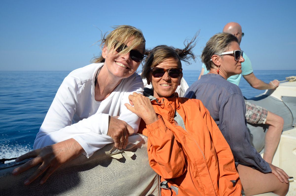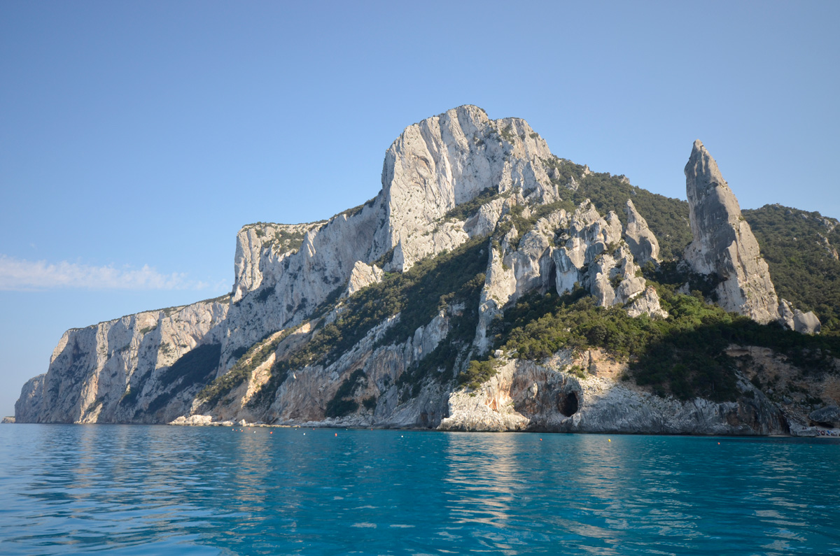 Mario andò in testa e in breve raggiungemmo il bosco in cima che traversammo lungamente per andare a prendere la sommità del grande canalone che delimita la parete. Mario e Giulia erano molto gentili con me, si offrirono di portare tutto il materiale, ma io… era solo di acqua che avevo bisogno… e naturalmente l’avevamo finita. La forza di gravità mi spingeva giù nel canalone di detriti, irregolare, sconnesso. Le ginocchia facevano fatica, ma lì almeno eravamo all’ombra. Dopo aver messo i piedi nell’acqua putrida del primo lago, ci avviammo stancamente nella risalita della dorsale che ci avrebbe riportati alla Tomba del Gigante e a Sedda Ar Baccas. Ormai con il culo in auto, tutto mi convinceva che non avevo più il fisico e che perciò dovevo lasciarmi permeare ancora di più dalla magia della Sardegna, ben oltre le arrampicate: così mi entusiasmai perfino nella classica traversata in gommone da Santa Maria fino a Cala di Luna, con Guya, sua cugina Simona e altri turisti assortiti. A proposito… anche qui ce ne sarebbe da raccontare…