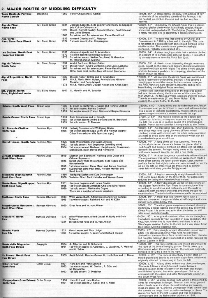 Per tutti questi motivi è pressoché impossibile classificare accuratamente le salite di ghiaccio; gli elenchi riportati sono quindi suddivisi in sole tre categorie di difficoltà. I percorsi sono stati assegnati a queste categorie sulla base delle descrizioni e dei gradi delle guide inglesi e continentali, della lunghezza e della pendenza media (misurate da mappe topografiche ove possibile, e quindi spesso diverse dalle cifre riportate nelle guide), e sulla base dell’esperienza personale dell’autore e di altri alpinisti. La prima categoria corrisponde più o meno ai gradi francesi ED o TD sup (limite inferiore probabilmente il Lyskamm), la seconda con TD o TD inf (limite superiore Grosshorn, limite inferiore l’Aiguille du Plan), e la terza con D sup/TD inf (limite inferiore Couloir Gervasutti, Nord del Gran Paradiso, Bernina). Come risulterà evidente dai limiti citati, diverse salite sono state migliorate o ridotte rispetto ai punteggi della guida; il gruppo 2/gruppo 3 borderline, in particolare, ha dato luogo a molti casi dubbi. Le salite sono raggruppate a livello regionale all’interno di ciascuna categoria di difficoltà. I dettagli della prima salita, della prima invernale e della prima solitaria sono forniti dove noti. Le salite note per aver avuto ascensioni britanniche sono indicate da un asterisco.
