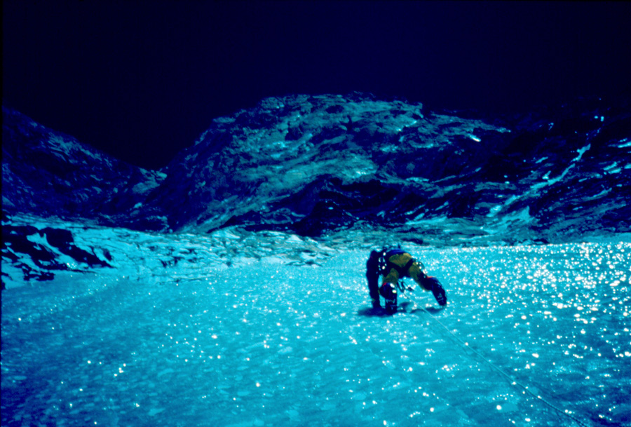7000 metri. Una piccola tenda, cosiddetta da bivacco, montata male di fretta e furia sotto una fitta nevicata. Sotto di noi un grande salto che finisce centinaia di metri più in basso sugli scivoli di ghiaccio tagliati dalle nostre corde fisse. Una slavina dietro l’altra ci piomba addosso; la neve ci penetra ovunque, sembra voler toglierci la forza di respirare. Poco più in là, nel centro della parete, è un via vai di slavine più grosse che, rumoreggiando, percorrono tutto il versante. Ha più l’aspetto di una stazione ferroviaria che del campo 3. Le mani fanno male dal freddo ed alcune dita sono oramai blu. È venuto il momento di entrare in questa specie di riparo che sarà il nostro tetto per questa eterna notte. Tremendo. La tendina, posta in questo angusto terrazzino scavato nel ghiaccio, resiste all’attacco delle slavine e solo uno strappo creatosi nel telo vicino all’ingresso rovina l’atmosfera di protezione. Purtroppo lo strappo è dal mio lato…