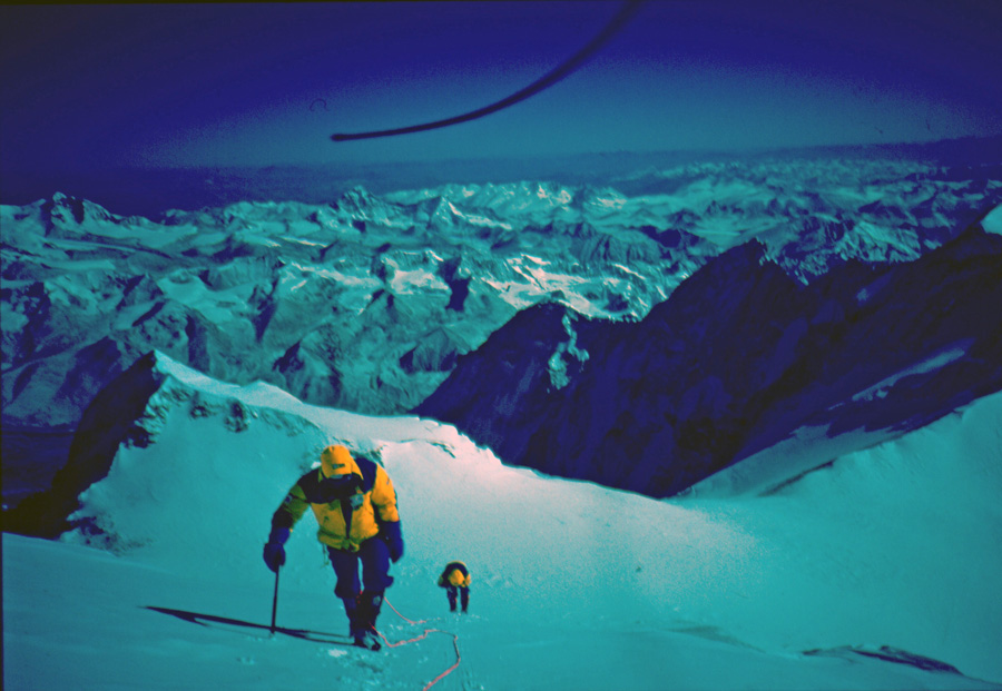 Arrivano poi Dario, Tirta, Mingmar e Fabrizio. La vetta è piccolissima, ci stanno solo due persone per volta, così a turno facciamo le foto e ci scambiamo i complimenti. Fabrizio, piangendo dall’emozione, chiama il campo base. La radio è piena di gioia ed a turno ognuno dice la sua. È ora di scendere, è più di un ora che siamo qui, sono passate le 15 e la discesa non la conosciamo. Seguiamo una cresta affilata per poi trovarci in piena parete che scendiamo con 5 doppie per trovarci nel buio della sera sul plateau. Trovare le nostre tracce risulta inutile e così anche per il canalone. Alle 9 decidiamo di bivaccare vicino ad un buco, dove si infila solo Fabrizio che ha una brutta botta alla gamba. Dal campo 2 ci fanno segnali di luce, ma non c’è nulla da fare, dobbiamo aspettare le luci dell’alba. Bivaccare a 8000 metri senza nulla non è molto bello. La notte più lunga e fredda della mia vita passata a fumare sigarette e a fregarsi mani e piedi.