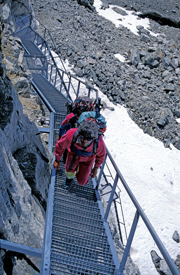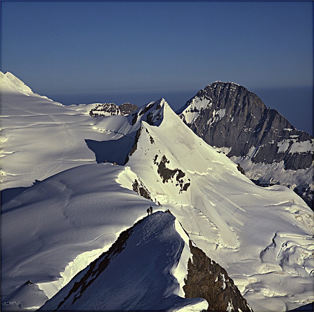 Il 7 luglio 1995, dopo esserci svenati con la ferrovia che dalla Kleine Scheidegg porta allo Jungfraujoch, Marco Milani, Federico Raiser ed io ci dirigemmo alla Mönchsjochhütte, depositammo il grosso del nostro bagaglio a spalle e continuammo per l’Unders Mönchsjoch, per affacciarci su Grindelwald. Passata la notte alla Mönchsjochhütte, la mattina dopo (solo Marco ed io) salimmo sulla non banale cresta nord-ovest del Trugberg 3933 m, ma ci fermammo più o meno a quota 3800 m. Lo scopo era quello di fotografare il Mönch e l’Eiger da sud: e ci riuscimmo in pieno. In seguito scendemmo all’Unders Mönchsjoch e ci ricongiungemmo con Federico. Ci addentrammo nel cuore dell’Oberland scendendo verso Konkordiaplatz, fermandoci innumerevoli volte per scariche di fotografie. Solo a tardo pomeriggio risalimmo le scale metalliche per raggiungere la Konkordiahütte 2850 m. Di montagne ne abbiamo viste tante, ma di certo la grandiosità di questo luogo non ha paragoni nelle Alpi: neppure il Monte Bianco o il Monte Rosa possono uguagliare questa sensazione di gigantismo, dove i ghiacciai la fanno da padroni sulle pur grandiose vette.