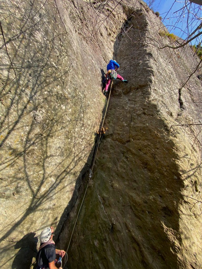 Comunque, belle le fessure eh, ma oggi sono qui per Chiara, era da tempo che volevo scalare con lei, e intendiamoci, non al solo fine di scalare. La prima volta l’ho vista al fiume, io col pad a spalle a cercare nuovi blocchi, lei da sola a suonare l’ukulele in costume, seduta su un sasso in mezzo all’acqua. Ditemi voi come si fa a non perdere la testa.