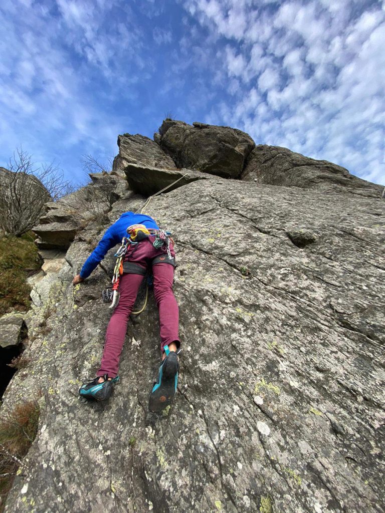 È una tersa giornata d’autunno quando, con Chiara, sto camminando tra i maestosi faggi del colle del Lys. Non c’è stagione migliore per scalare qui. È la prima via che faremo insieme e la scelta è ricaduta su Titanic, una via a spit di sei tiri di 6b sul solitario Torrione Ovest di Mompellato. Non è un caso se ho scelto questa via, qualche tempo fa il buon Teddy, che conosce bene il mio feticismo per le fessure, mi ha consigliato di dare un occhio al diedro qualche metro a sinistra della “sua” Titanic.