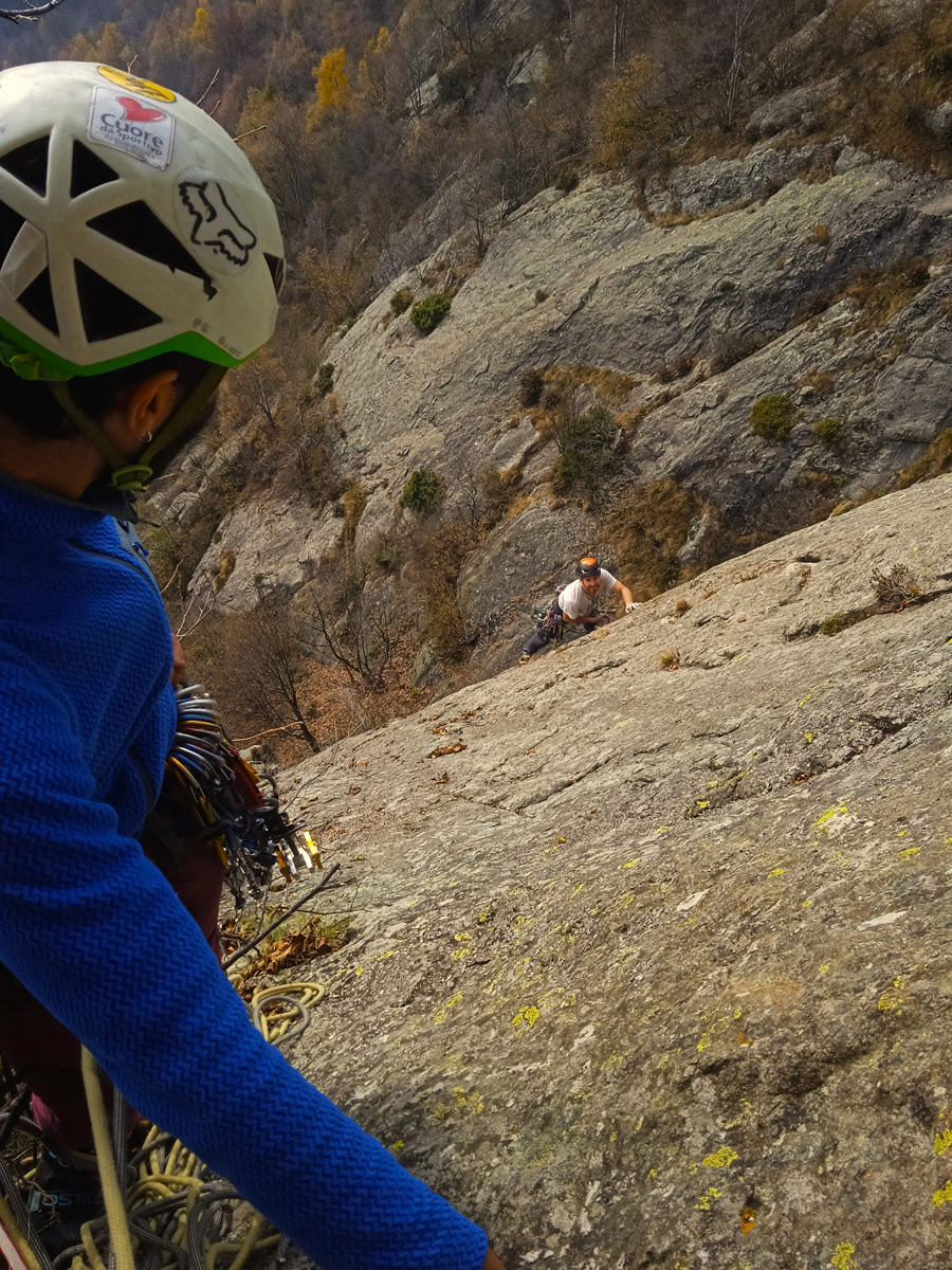 Tra l’avvicinamento, la pulizia del primo tiro e i convenevoli son già volate due ore, Gioele mi guarda e mi fa: “Sai che c’è Albi?”. “Sì, lo so, attacchiamo dal basso. Fanculo la perlustrazione”. “Esatto”.