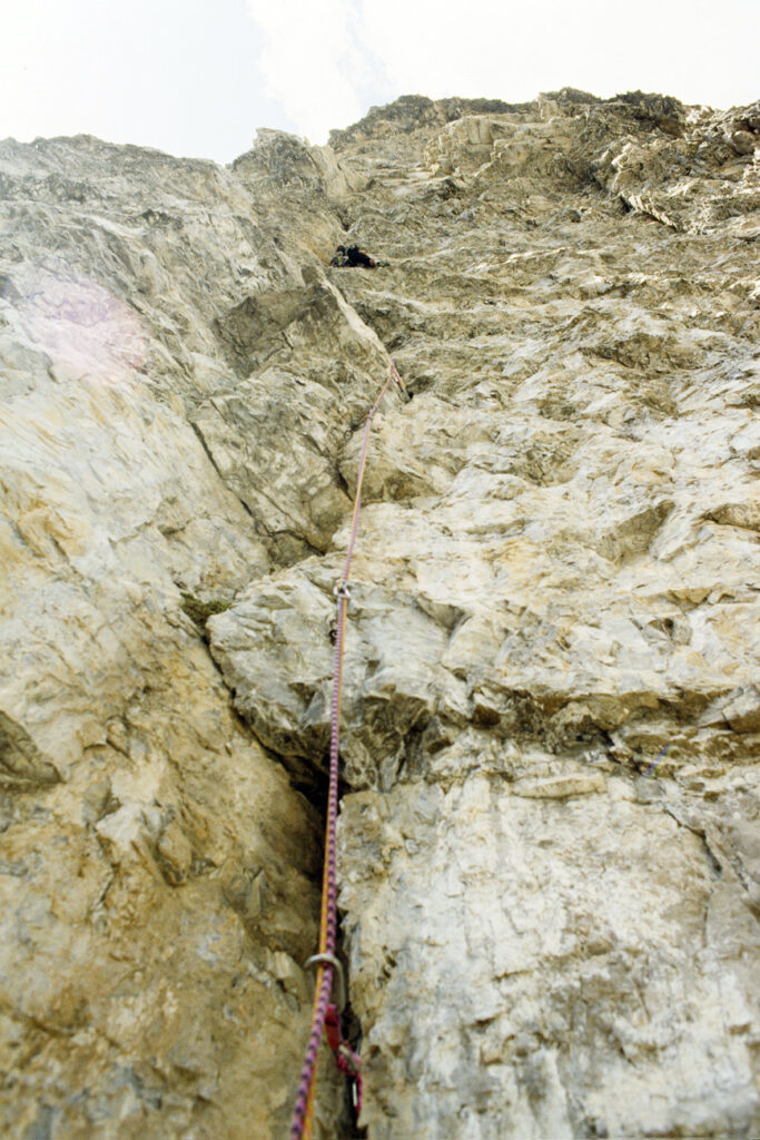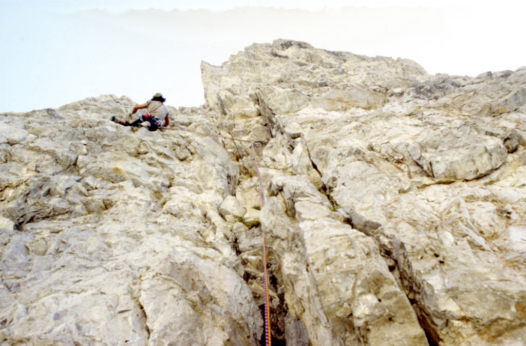Anche per me non c’era alternativa. Mauro si offrì di cominciare e salì per 40 m tra il V+ e il VI- fino ad una stretta cengia dove fece sosta. Continuai io per quella che sembrava una parete ancora più aperta, solcata da una fessurina davvero superficiale. Procedevo lentamente, anche perché l’inizio fu davvero difficile: lo risolsi con un passo di A0, poi continuai (VI) fino a fermarmi dopo 25 m. Con l’accordo dei buoni fratelli, Mauro iniziò la terza lunghezza. Qualche bestemmia fu necessaria per superare un tratto di A0 e VI (che io poi da secondo salii in libera, VII). Superando due tettini, salì fino a un grande tetto (VI+) che lo obbligò a traversare a sinistra (VI+) per guadagnare la sosta, ormai in corrispondenza della via di Cetin, proprio alla base del tiro che aveva fermato Comici.