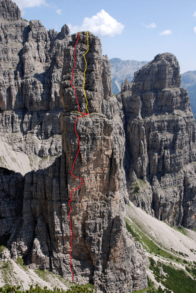 Ancora una volta ero alla base di una parete storica, in procinto di affrontarla per cercare di aprire una via nuova magari più diretta. Emilio Comici e Severino Casara avevano tentato di salire la sezione di sinistra, riuscendo ad arrivare abbastanza in alto senza però raggiungere il Ballatoio. L’itinerario fu ripreso e completato da Giuseppe Pino Cetin e Spiro Dalla Porta Xydias (VI, 170 m, 31 agosto/1 settembre 1955)). Sull’estrema destra della parete era stata aperta la via di Raffaele Carlesso e Maurizio Toto De Zanna (130 m, VI e VI+, 20 settembre 1961). Il centro era libero, giallo e abbastanza scoraggiante.