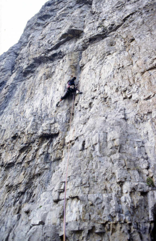 Dopo una prima fessura-diedro di VI- segue un tratto facile in obliquo a destra e una traversata friabile di VI- sotto a un tetto. La quarta lunghezza toccava a me e subito mi sono trovato incagliato su una paretina ostica: occorreva salire in parete aperta per raggiungere una serie di fessure e diedri che avevamo individuato dal basso. Rimasi fermo a 7-8 m da Mauro che mi assicurava, incapace di salire né in libera né in artificiale. Vedevo che era questione di un metro, ma non c’era verso. Allora presi in mano il chiodino più piccolo che avevo (un Cassin, il più piccolo del loro catalogo), e provai a piantarlo in quelli che potevano sembrare dei buchetti nella dolomia. Dopo un po’ di tentativi fui fortunato e riuscii a martellarlo con un suono confortante. Con l’aiuto di una staffa superai il pezzetto difficile e mi ritrovai a salire sul VI- con difficoltà decrescenti fino alla sosta, alla base della lunga linea di fessure. Mauro non mi lesinò i complimenti, perché secondo lui l’aver messo quel chiodino era stata una “piccola opera d’arte”.