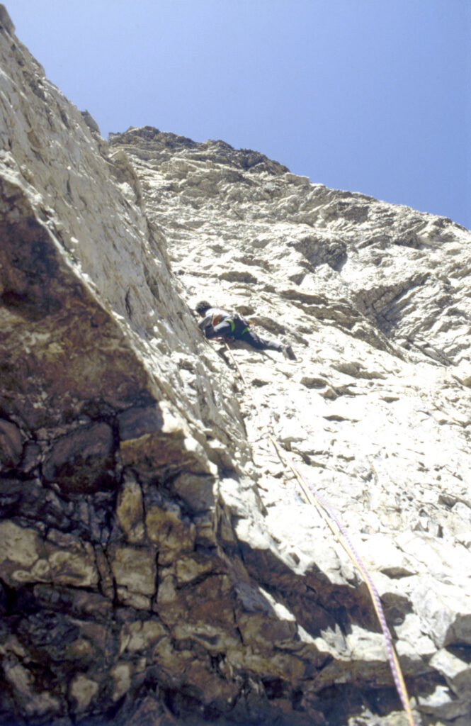 Non era neppure lontanamente immaginabile proseguire a destra di questo itinerario, per lo meno con la nostra attrezzatura classica, senza spit da piantare. Così decidemmo di servirci della spaventosa fessura che sale a sinistra della via Cetin, in pratica decidemmo di intersecarla. Toccava a me. Trangugiata quella poca saliva che avevo, mi impegnai su quella fessura strapiombante, riuscendo, direi incredibilmente, a salire in libera lo strapiombo e a fermarmi dopo 25 m (VI+ e VII-). Poi proseguii ancora per la fessura, più verticale ma sempre durissima, che mi portò dopo altri 35 m (dal V+ al VII) quasi alla fine delle difficoltà. Mancavano ancora 20 m per raggiungere il Ballatoio: li fece Mauro in un attimo (IV, un passo iniziale di VI+). Giunti alla grande terrazza del Ballatoio valutammo se proseguire o meno fino alla vetta: alla fine decidemmo che non valeva la pena, ci sarebbe stata troppa differenza con le difficoltà che avevamo appena superato. Tanto valeva seguire per gli ultimi due tiri la via di Cetin e Dalla Porta, che comunque era lì a pochi metri.