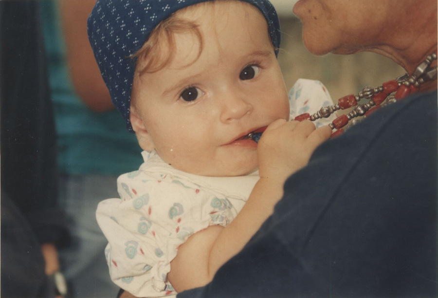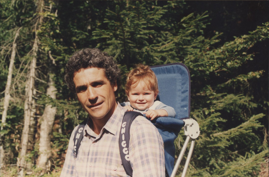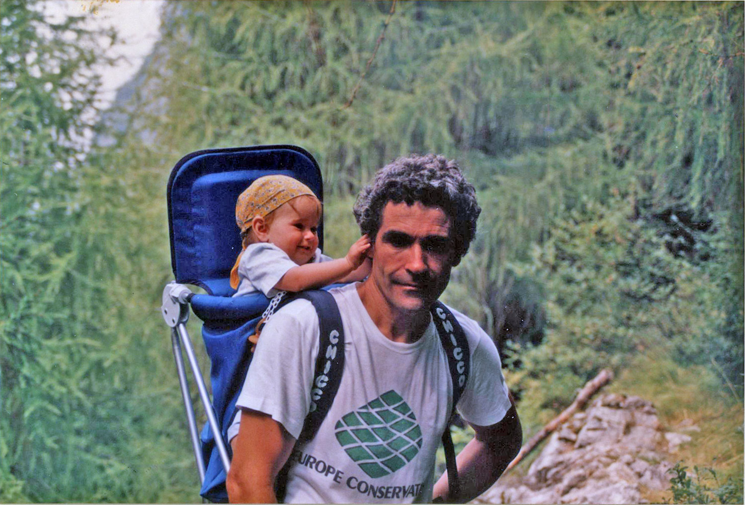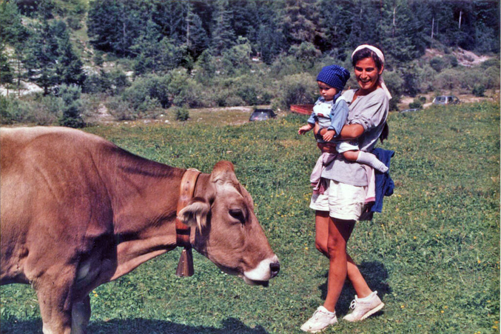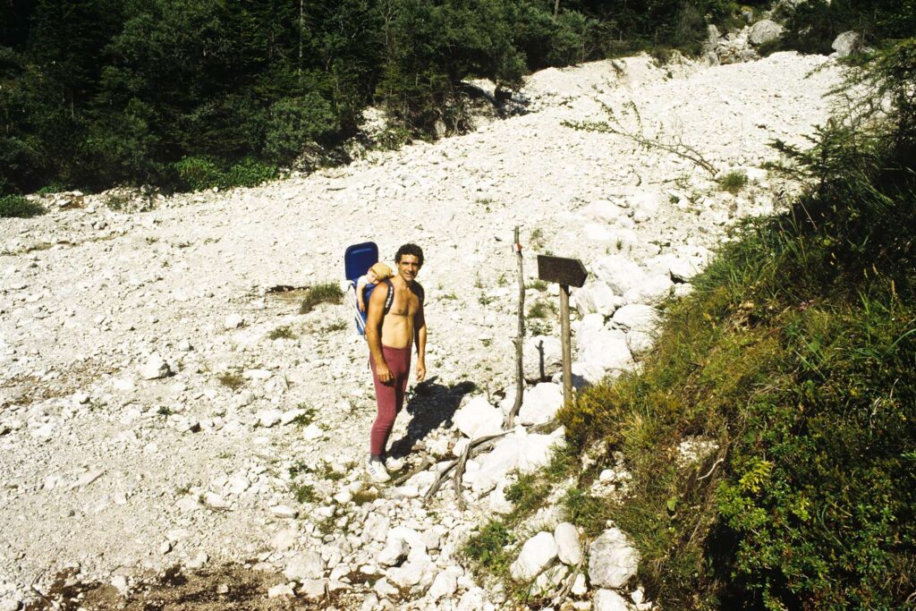 Oramai ci eravamo perfettamente organizzati, perciò riuscivamo a muoverci senza problemi. All’inizio sembrava che gestire una bambina di neppure nove mesi senza l’organizzazione dispiegata a Levanto fosse molto difficoltoso. E invece, dopo aver messo bene a punto l’elementare dotazione di cui disponevamo, scoprimmo che alla fine tante cose non sono necessarie… Il 23 agosto guadagnammo il rifugio Pussa in Val Settimana e il Pian de Mio, un luogo strapieno di mucche. E il giorno dopo, da Cellino di Sopra 514 m, salimmo alla Forcella Frugna 1570 m: la guida per questo itinerario dà giustamente 3.30 ore. Noi impiegammo più tempo, visto il prezioso carico che avevo sulla schiena, ma ne valse la pena. Peccato per la nebbia che c’impedì di vedere il Col Nudo se non a sprazzi.