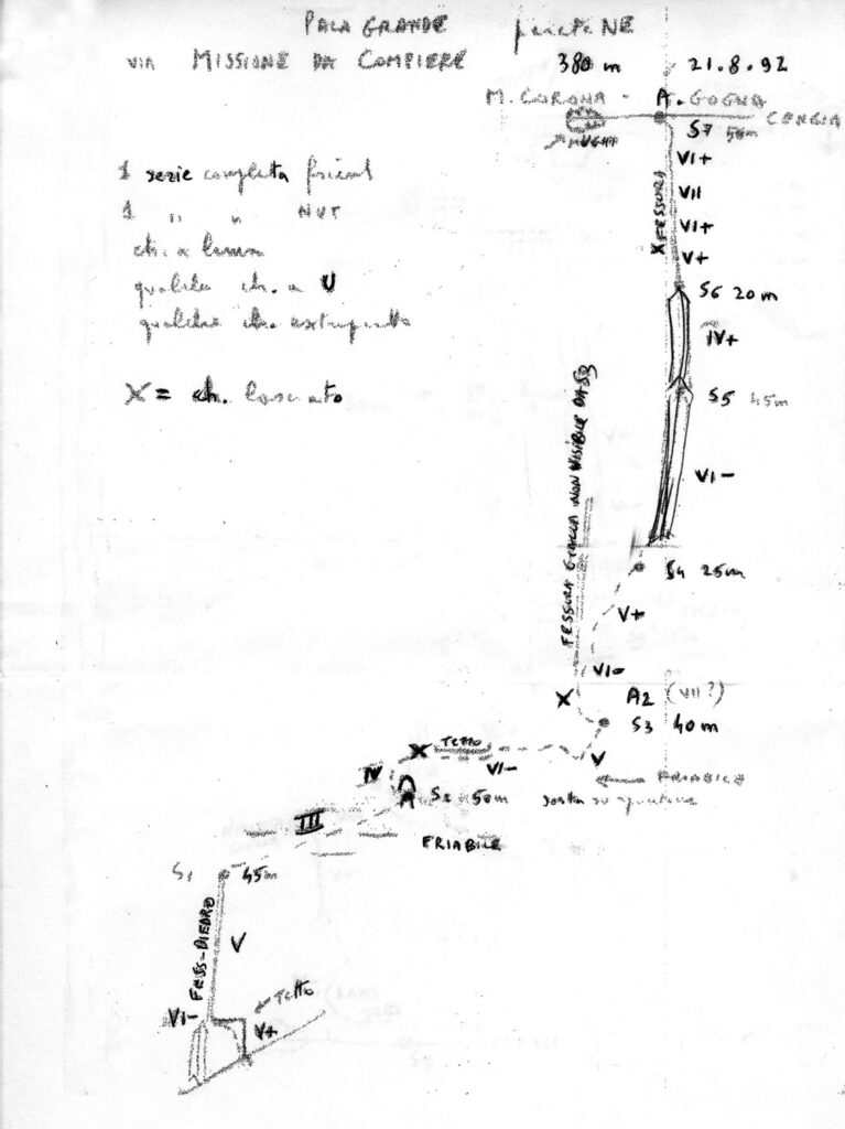 Sapevamo però che c’era un’altra linea di fessure, che dovevamo raggiungere con arrampicata obliqua a destra. Salimmo un tiro di 40 m di V+ che ci portò, attraversata una nicchia gialla, già nei primi metri del lungo obliquo a destra. La nona lunghezza, tutta in obliquo, in generale non fu difficile, a parte un passo di VI-. Ci ritrovammo così su un’altra grande cengia, alla base della linea finale di fessure-diedro. Con due lunghezze da 50 m le salimmo, con difficoltà continue di V+ e VI-, arrivando così in zona vetta. Da lì traversammo una cengia per 80 m a destra e iniziammo una serie di corde doppie (cinque, per 215 m) che ci riportò al ghiaione a nord della parete. Chiamammo la nostra via Missione da compiere.