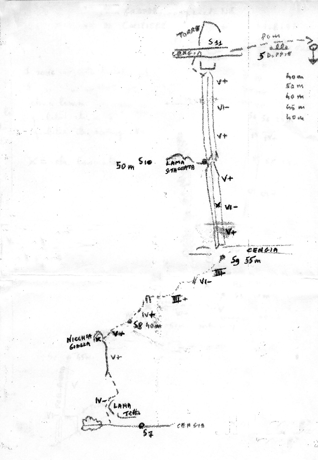 In seguito la cosa ci dispiacque e ci ripromettemmo di tornare e concludere in bellezza. Ma non ci fu più l’occasione… Era l’anno in cui si celebrava il novantennale della prima salita al Campanile. Chiamammo perciò la nostra via Novant’anni di Solitudine.