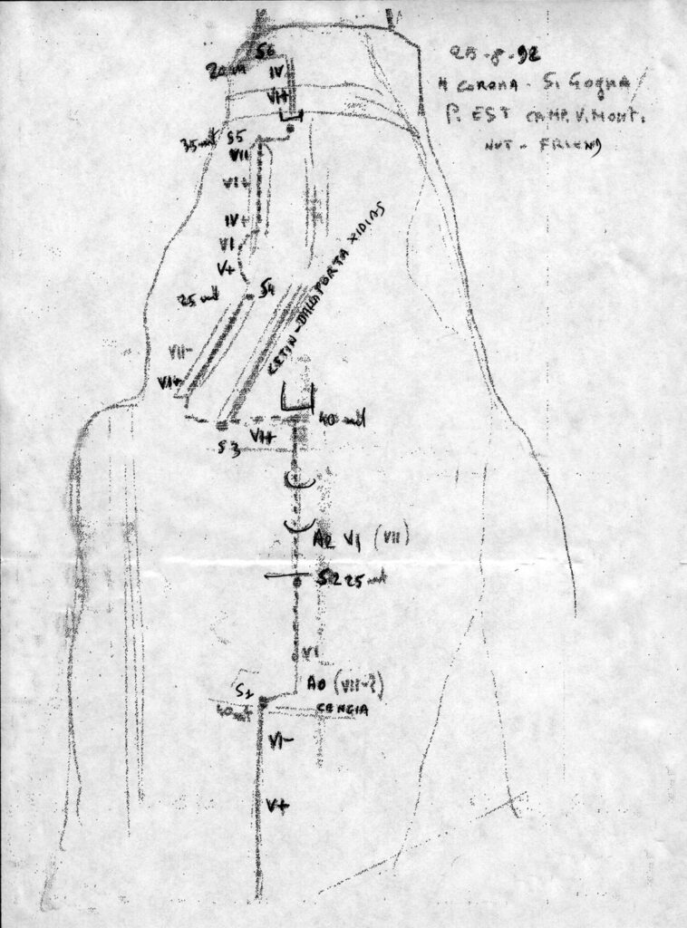 Non era neppure lontanamente immaginabile proseguire a destra di questo itinerario, per lo meno con la nostra attrezzatura classica, senza spit da piantare. Così decidemmo di servirci della spaventosa fessura che sale a sinistra della via Cetin, in pratica decidemmo di intersecarla. Toccava a me. Trangugiata quella poca saliva che avevo, mi impegnai su quella fessura strapiombante, riuscendo, direi incredibilmente, a salire in libera lo strapiombo e a fermarmi dopo 25 m (VI+ e VII-). Poi proseguii ancora per la fessura, più verticale ma sempre durissima, che mi portò dopo altri 35 m (dal V+ al VII) quasi alla fine delle difficoltà. Mancavano ancora 20 m per raggiungere il Ballatoio: li fece Mauro in un attimo (IV, un passo iniziale di VI+). Giunti alla grande terrazza del Ballatoio valutammo se proseguire o meno fino alla vetta: alla fine decidemmo che non valeva la pena, ci sarebbe stata troppa differenza con le difficoltà che avevamo appena superato. Tanto valeva seguire per gli ultimi due tiri la via di Cetin e Dalla Porta, che comunque era lì a pochi metri.