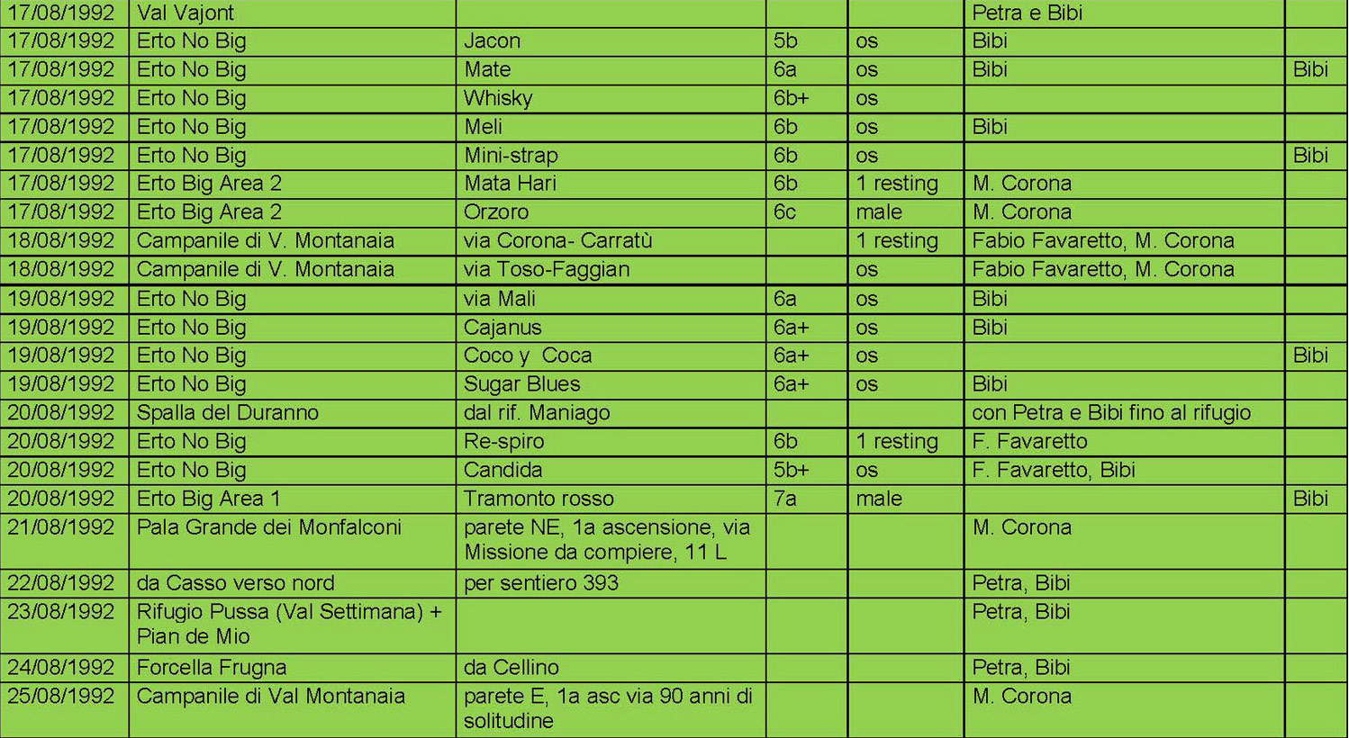 Il 17 agosto 1992 con Petra e Bibi rifacemmo la stessa gita in Val Vajont, ma non andammo oltre il punto raggiunto a maggio. Ci bastava quell’incomparabile solitudine incorniciata da montagne selvagge, senza alcuna traccia umana. Il giorno dopo, lasciate Bibi e Petra al rifugio Pordenone, Mauro Corona, Fabio Favaretto ed io salimmo alla base della parete ovest del Campanile di Val Montanaia, allo scopo di ripetere la via che lo stesso Mauro aveva aperto con Claudio Carratù e Giuseppe Giordani nell’agosto 1990. Si rivelò un itinerario di una logicità massima, su roccia buona e in grande esposizione. Fu anche abbastanza impegnativo non cedere alla tentazione di attaccarsi a qualche chiodo…