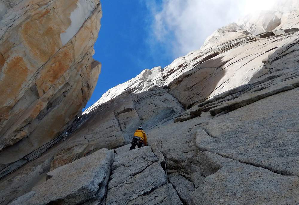 Abbiamo infilato due vie bellissime con un giorno di riposo nel mezzo, quello di maltempo, mentre tutti gli alpinisti del mondo arrivati a El Chaltén se ne sono rimasti in paese perché si vociferava che il tempo sarebbe rimasto orribile. Le nostre previsioni erano eccellenti, avendo pure azzeccato l’ora in cui avrebbe smesso di nevicare la mattina del secondo giorno di maltempo, le dieci, per lasciare al sole e al cielo blu il resto della giornata. Noi sulla Guillaumet per la Amy-Vidailhet il primo colpo e poi alla Mermoz per la Hypermermoz+Argentina il secondo, mentre Franz e la sua cliente est-europea che abbiamo soprannominato Dobrinska Bratislava ma si chiama in maniera totalmente diversa, hanno salito pure loro la Amy ma solamente fino alla fine della goulotte e poi la cresta Giordani e la Fonrouge sempre alla Guillaumet.