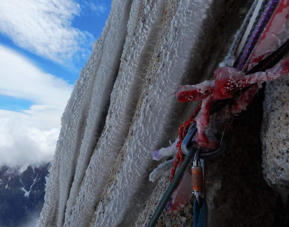 Abbiamo infilato due vie bellissime con un giorno di riposo nel mezzo, quello di maltempo, mentre tutti gli alpinisti del mondo arrivati a El Chaltén se ne sono rimasti in paese perché si vociferava che il tempo sarebbe rimasto orribile. Le nostre previsioni erano eccellenti, avendo pure azzeccato l’ora in cui avrebbe smesso di nevicare la mattina del secondo giorno di maltempo, le dieci, per lasciare al sole e al cielo blu il resto della giornata. Noi sulla Guillaumet per la Amy-Vidailhet il primo colpo e poi alla Mermoz per la Hypermermoz+Argentina il secondo, mentre Franz e la sua cliente est-europea che abbiamo soprannominato Dobrinska Bratislava ma si chiama in maniera totalmente diversa, hanno salito pure loro la Amy ma solamente fino alla fine della goulotte e poi la cresta Giordani e la Fonrouge sempre alla Guillaumet.