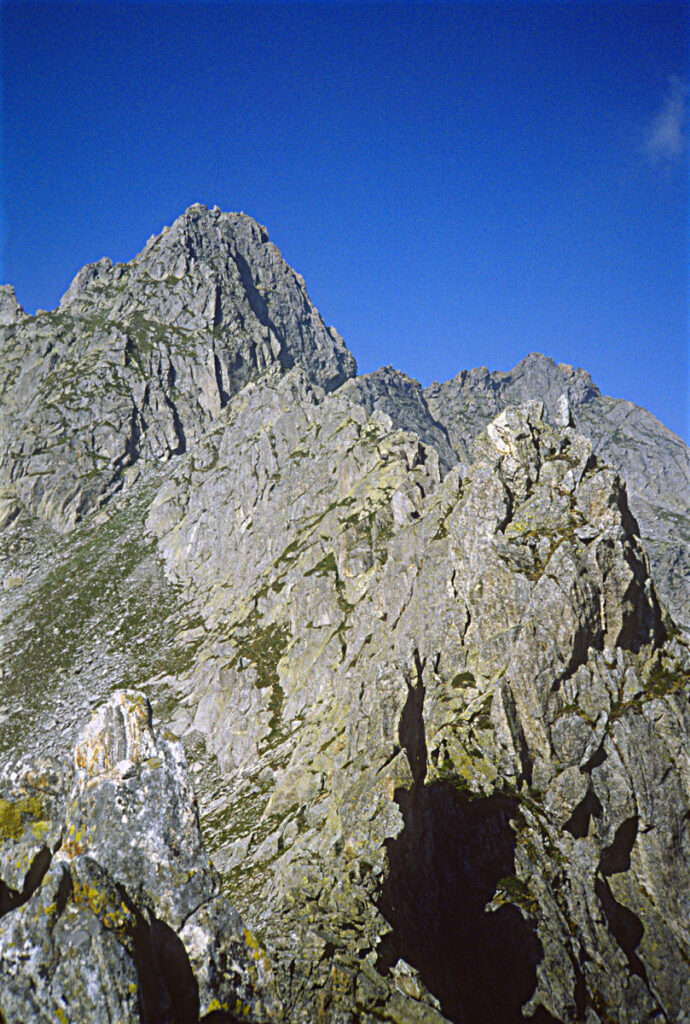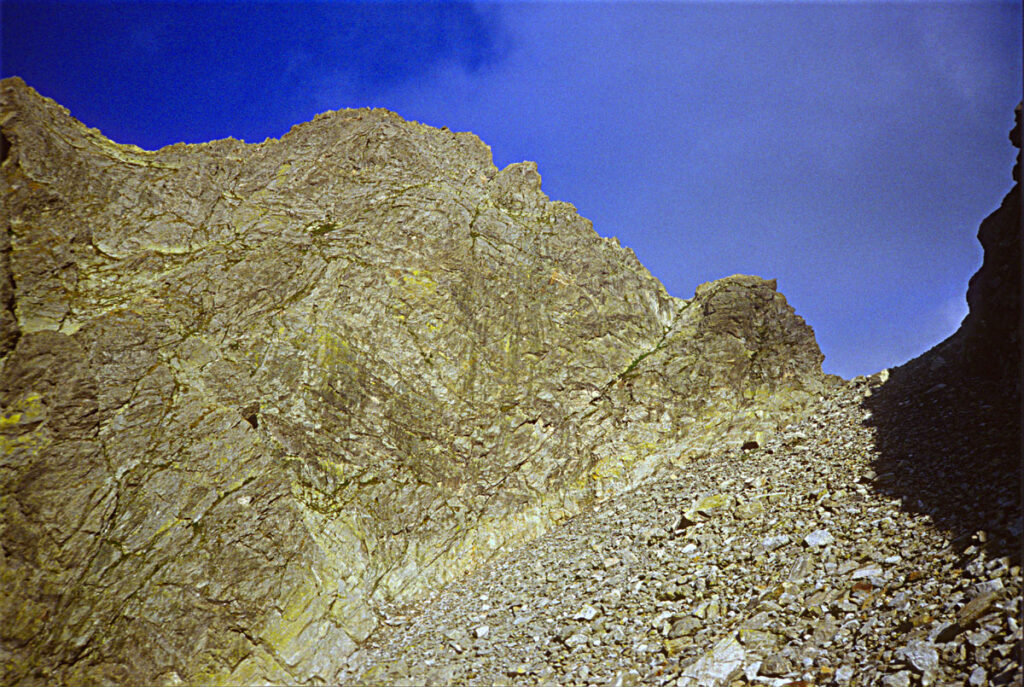 Il 2 novembre avrebbe dovuto essere dedicato all’esplorazione della parete est del Pizzo Campanile, ma quando ne fui alla base non resistetti al fascino dello Scudo, una grande placca compatta che costituisce la metà inferiore della parete est. Oggi sono almeno sette gli itinerari che lo risalgono, ma allora era assolutamente libero da vie. Mi colpì subito l’elegante fessurina al centro della parete, davvero estetica. Sono quattro lunghezze, con le difficoltà concentrate (fino al VI+) nella prima e nella terza. In ogni caso oggi la posso giudicare una delle mie vie più belle. La battezzammo Piccola Creatura.