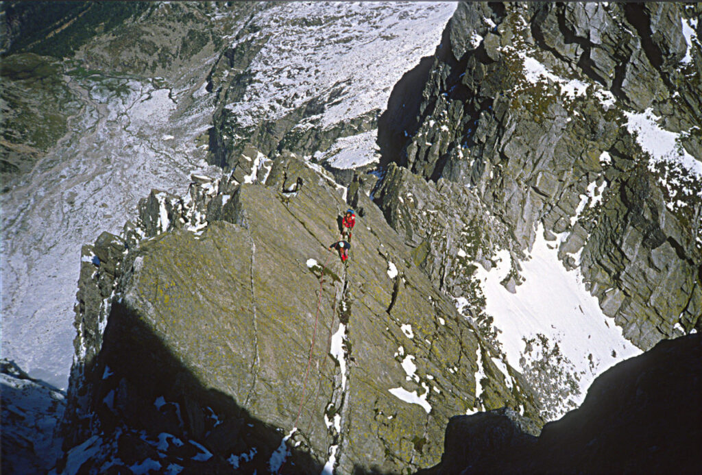 Fino a quel punto, a parte il tetto, avevo arrampicato in libera (fino al VII-): ma a quel punto, sull’ultima lunghezza, ero pronto pur di far presto ad attaccarmi a qualunque cosa. Invece, fortunatamente, quel tiro non superava il V+. Scendemmo rapidamente a sud, all’intaglio con la Terza Punta di Gratella (il Tridente), e da lì attrezzai una breve serie di corde doppie a est, fino alla base. Eravamo abbastanza scossi, perciò non esitai a proporre a Nella di scendere e tornare a casa.
