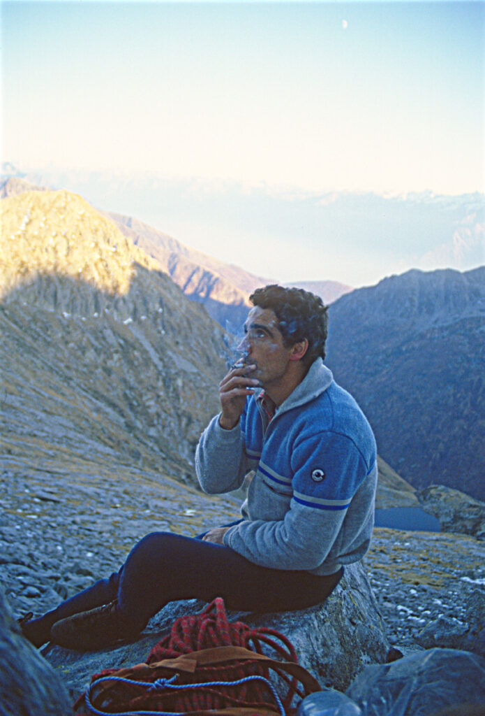 Angelo incominciò ad aggirarsi con il suo vecchio macchinone (un po’ da zingaro) a est e a ovest del Passo dello Spluga. Dormiva regolarmente in auto e ogni giorno macinava dislivelli assurdi in un’esplorazione puntigliosa: obbligatorio salire ogni vetta importante per tutte le creste e pareti fino al terzo grado e oltre. Il Pizzo Tambò, il Suretta, il Pizzo del Ferro e il Pizzo Stella erano le sue mete, d’estate, d’inverno e sempre da solo, totalizzando circa 100-110 giornate-lavoro, senza calcolare quelle in attesa che la pioggia cessasse. In mezzo a queste sue cavalcate, sporadicamente lo accompagnavo su qualche bella salita e presto m’innamorai di quelle valli solitarie.