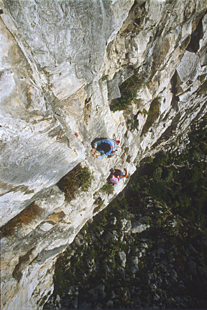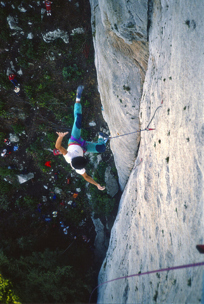 Era una giornata assai grigia e freddina, per nulla sorridente. La folla guardava all’insù e rabbrividiva. Marco Pedrini si esibì a Monte Cucco sulla prima lunghezza di Stravolgimento progressivo. Non in apparenza, ma le sue condizioni erano così pietose che a me, incaricato di fotografarlo, capitò più di riprendere voli spettacolari (più o meno voluti) che non fluida arrampicata sul 6b…