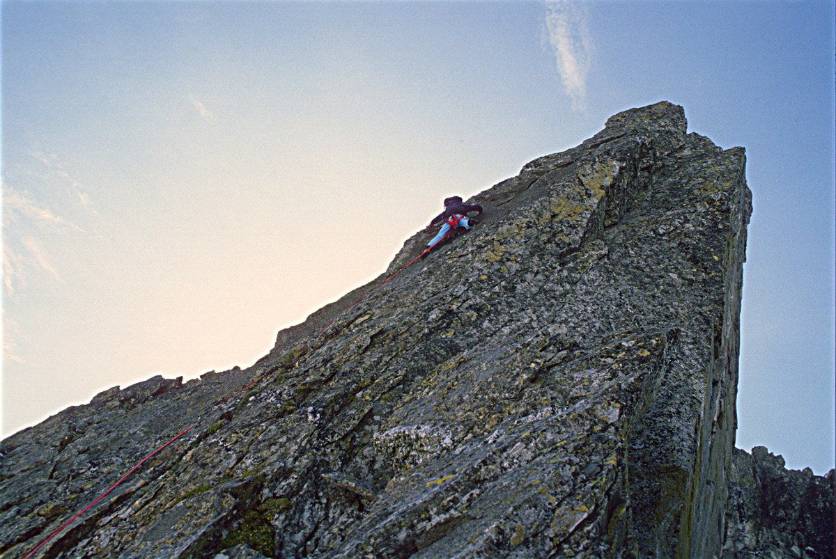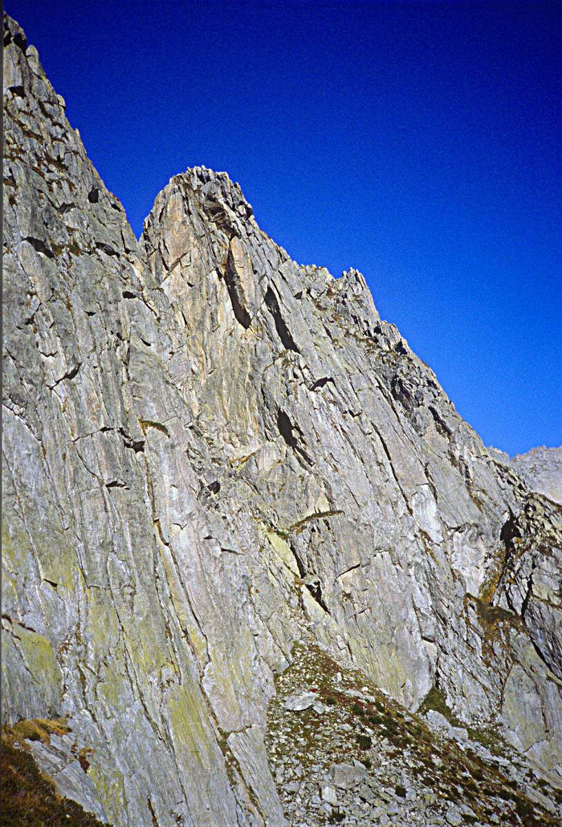 Il 2 novembre avrebbe dovuto essere dedicato all’esplorazione della parete est del Pizzo Campanile, ma quando ne fui alla base non resistetti al fascino dello Scudo, una grande placca compatta che costituisce la metà inferiore della parete est. Oggi sono almeno sette gli itinerari che lo risalgono, ma allora era assolutamente libero da vie. Mi colpì subito l’elegante fessurina al centro della parete, davvero estetica. Sono quattro lunghezze, con le difficoltà concentrate (fino al VI+) nella prima e nella terza. In ogni caso oggi la posso giudicare una delle mie vie più belle. La battezzammo Piccola Creatura.