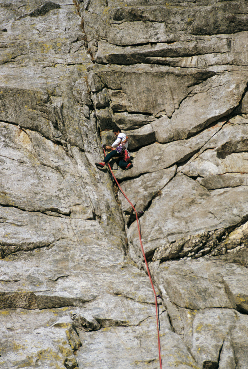 Il 1° settembre dunque Nella ed io approcciammo la base della parete, che da sotto non si preannuncia per nulla amichevole, anche se alta solo 130 m. C’è una netta e strapiombante fessura giallastra che s’impone subito all’attenzione. Un’arrampicata dura e atletica con soltanto sei chiodi in posto (i primi salitori ne avevano usati 25). Le prime due lunghezze si rivelarono subito dure, ma il passo chiave era costituito dal terzo tiro, sbarrato da un tetto quasi orizzontale. Qui dovetti piantare un chiodo o due, quelli presenti non bastavano. Anche dopo quello sbarramento orizzontale l’arrampicata era assai difficile, in un diedro. Raggiunto il posto di sosta, lo attrezzai a prova di bomba. Con Nella quasi non ci si sentiva. La poverina salì fino al tetto, lo superò, ma quasi alla fine, nel vuoto più nauseante, un vecchio chiodo (il penultimo prima dell’orlo) cedette e lei si ritrovò appesa. L’attrito m’impediva di recuperarla di peso con la manovra a carrucola: le urlai di risalire a prusik quei due metri che le mancavano all’ultimo chiodo del tetto. E così fece, riuscendo finalmente a togliere attrito sull’orlo. Nel frattempo io avevo costruito con cordini vari l’accrocchio necessario al recupero, perciò potei aiutarla parecchio negli ultimi metri. Mi raggiunse sfinita.