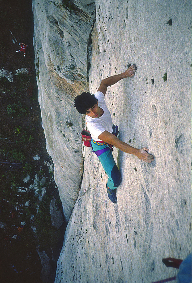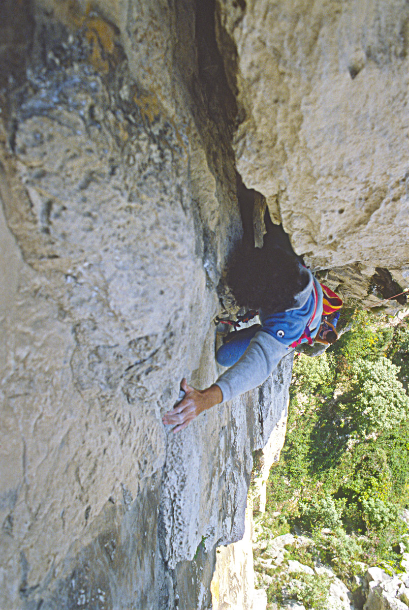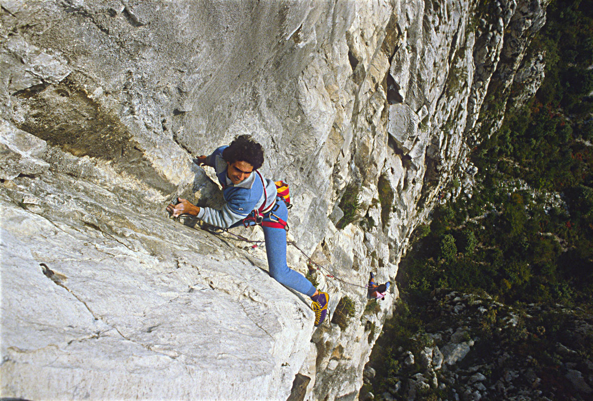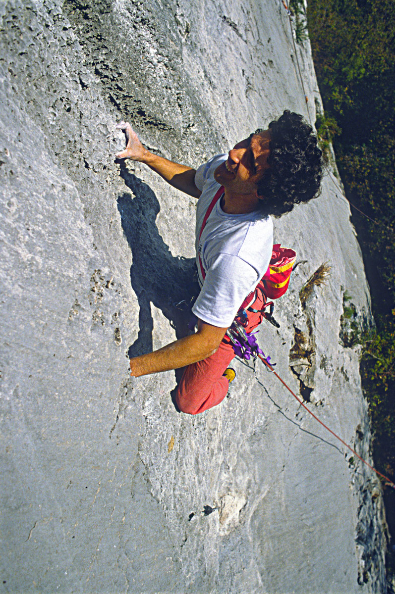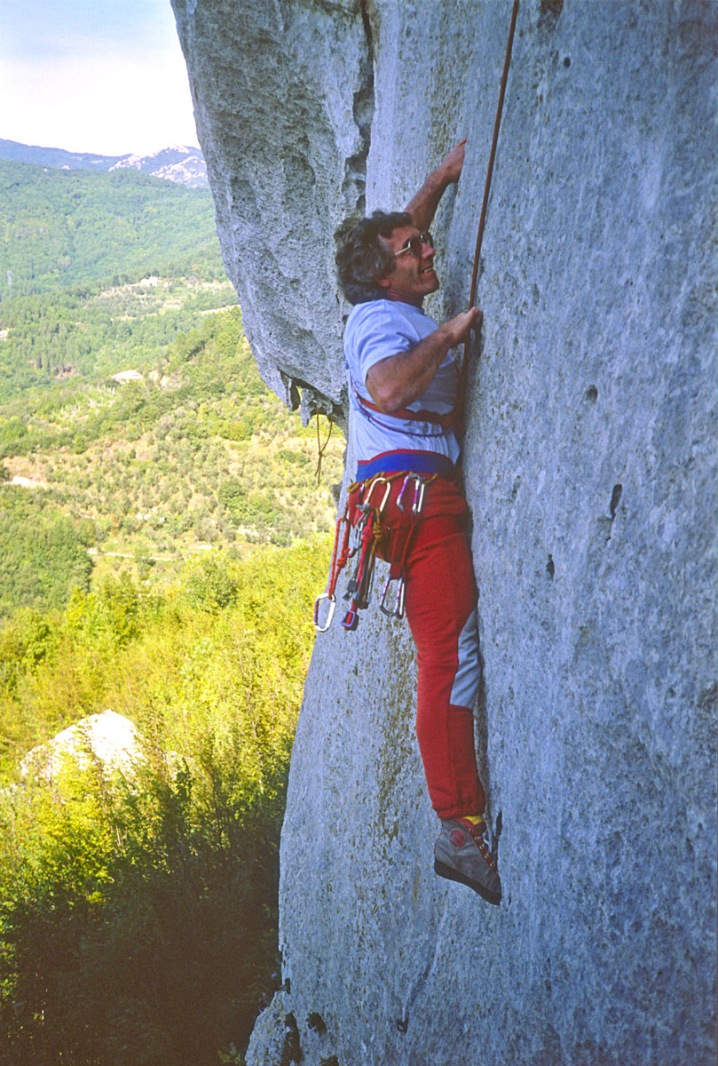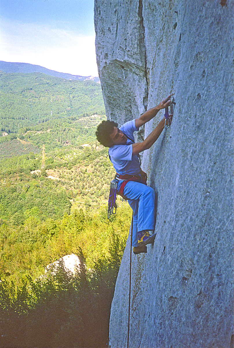 Era una giornata assai grigia e freddina, per nulla sorridente. La folla guardava all’insù e rabbrividiva. Marco Pedrini si esibì a Monte Cucco sulla prima lunghezza di Stravolgimento progressivo. Non in apparenza, ma le sue condizioni erano così pietose che a me, incaricato di fotografarlo, capitò più di riprendere voli spettacolari (più o meno voluti) che non fluida arrampicata sul 6b…