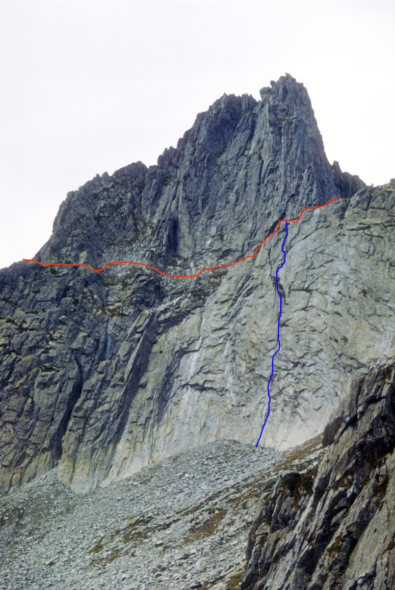 Il 9 settembre, pur con il terreno un po’ innevato da una recentissima nevicata, Nella, Angelo ed io facemmo un’unica tirata da Livo fino alla Bocchetta della Pizzetta, in alto pestando neve quanto basta: da lì il Pizzo Ledù è osservabile in tutto il suo splendore: ero stato lì due settimane prima con Anne-Lise per la prima ascensione della via dell’Onomastico. E avevo adocchiato la bellissima cresta nord-est, presumibilmente non così difficile ma molto elegante. La giornata era stupenda e ci godemmo la salita alla grande (135 m, con sviluppo assai superiore, al massimo un passo di VI-, roccia ottima). Sapevo che il 9 settembre segnava i quindici anni passati dalla morte di mia madre, così il nome della via fu ovvio: Mamma, son 15 anni!
