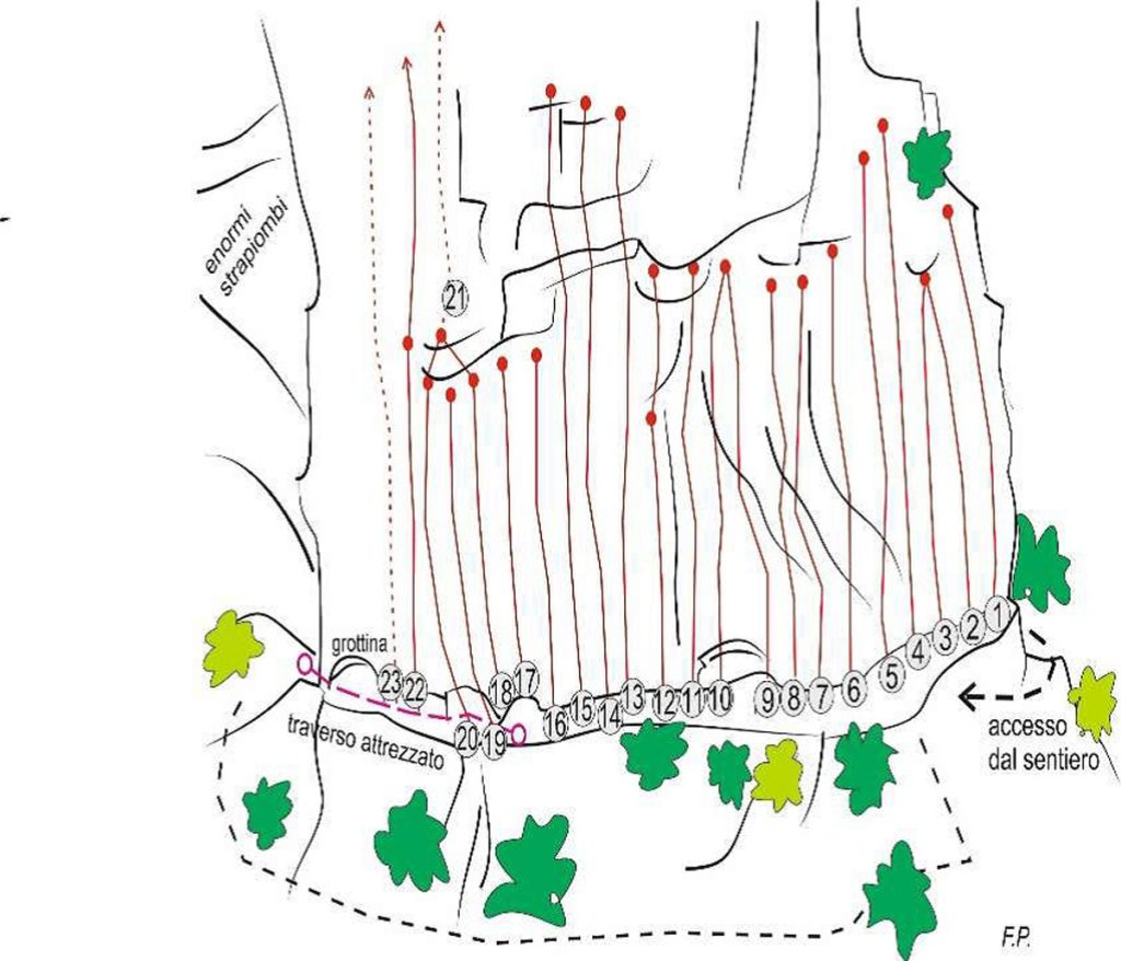 Scendere dal lato opposto poi traversare e risalire con corda fissa, giungendo alla base della falesia. 30′ circa.