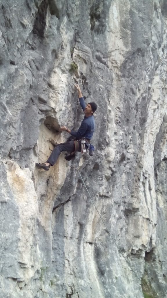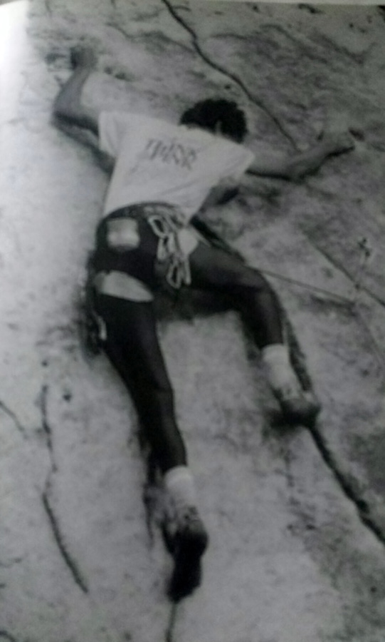 La ricerca della pura difficoltà era già nell’aria da diversi anni e da qui si conferma come gioco e come sfida con gli amici e con se stessi. È così che con duri allenamenti allora “sperimentali” ed empirici, fatti in casa, e con la frequentazione di tutte le falesie esistenti allora ed in grande sviluppo, il mio grado dal 6 lievitò a tutta la gamma del 7, con puntate sull’8…