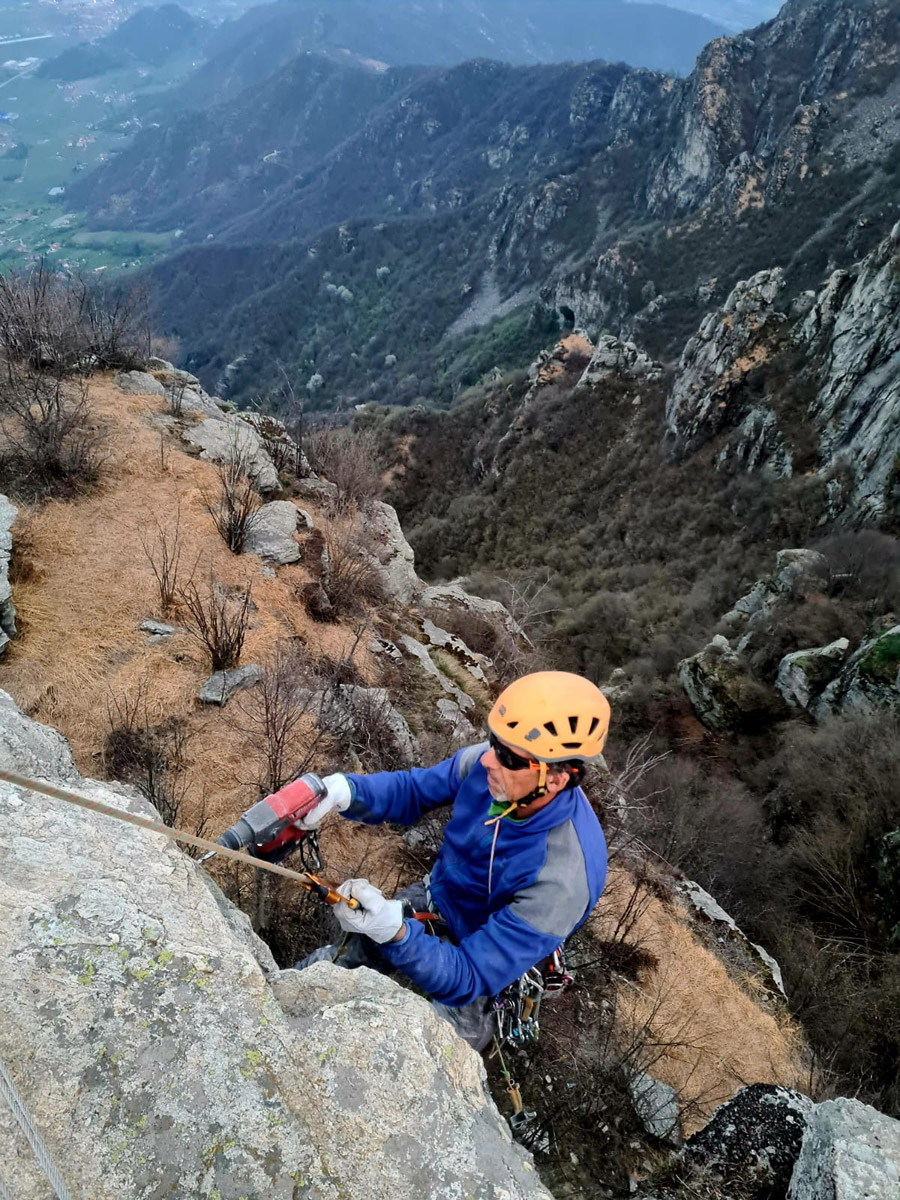 Veramente ho quasi sempre dovuto arrangiarmi da solo… anche un po’ al risparmio! Quindi mi scuso con i molti vecchi amici per certe chiodature non proprio rassicuranti! Ma con gli anni le idee sono un po’ cambiate ed insieme alla nascita dei nuovi itinerari “ben chiodati”, spesso mi butto in lavori di pulizia e richiodatura di interi settori, ormai esclusivamente con tasselli, placchette e soste in acciaio inox. Ora l’accuratezza del lavoro è quasi diventata… un chiodo fisso.