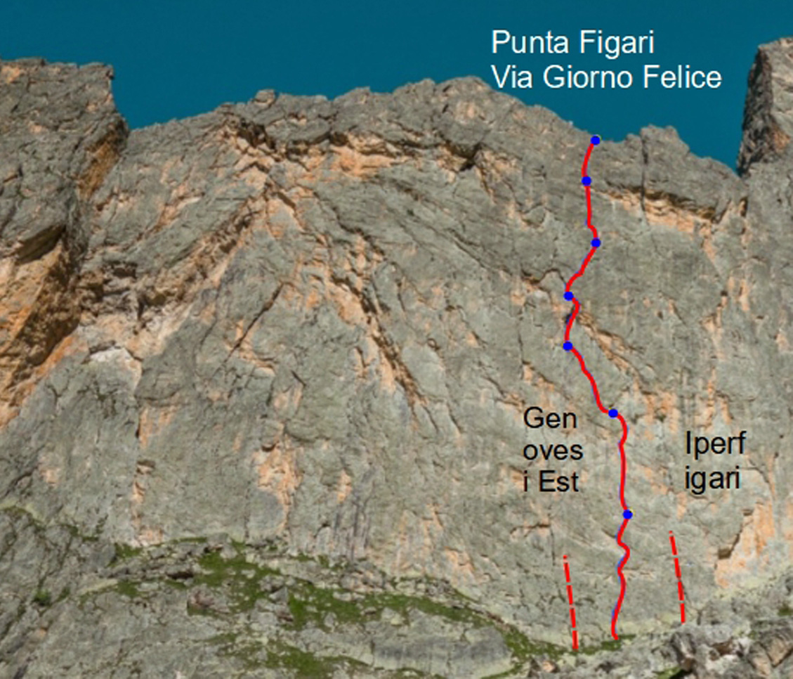 Itinerario diretto e in centro parete, corre parallelo e a destra della Via dei Genovesi Est (Ravaioni-Vaccari). Le difficoltà sono continue su roccia sempre buona. Il secondo tiro tecnicamente è il più impegnativo, ma tutta la salita richiede concentrazione e un po’ d’esperienza nel piazzare le protezioni. Attualmente sono presenti tutti i chiodi “normali” necessari (da controllare). Soste su chiodi, rinforzabili con friend. Presente 1 spit alla 2a sosta, piantato da Flavio in una successiva ripetizione.