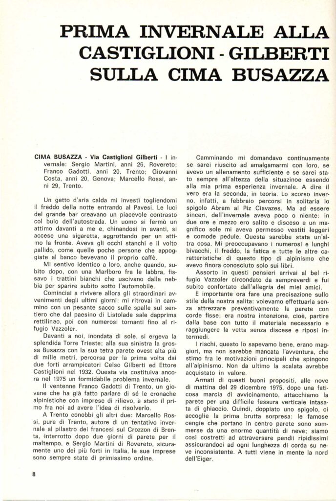 Giovanni Costa, genovese, il roveretano Sergio Martini e i trentini Marcello Rossi e Franco Gadotti, tutti poco più che ventenni, concepiscono l’idea di salire d’inverno la Castiglioni-Gilberti alla Cima Busazza, una delle grandi vie dell’era del sesto grado non ancora percorsa in invernale.
