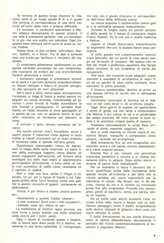 Così ricorda quell’avventura di 46 anni fa uno dei protagonisti, Sergio Martini: “Chiunque abbia vissuto a lungo la montagna, ha sicuramente avuto dei momenti in cui hanno prevalso determinati interessi su altri. Gli anni 70, per me, sono stati particolarmente significativi per l’attenzione che ho dedicato alle salite invernali. Per ragioni di vicinanza, le Dolomiti sono state le montagne che ho percorso con maggior frequenza e poterle visitare anche in inverno è stata una scoperta affascinante e pienamente coinvolgente per l’epoca. Forse un preludio per quello che sarà in seguito il mio interesse per le grandi montagne asiatiche.